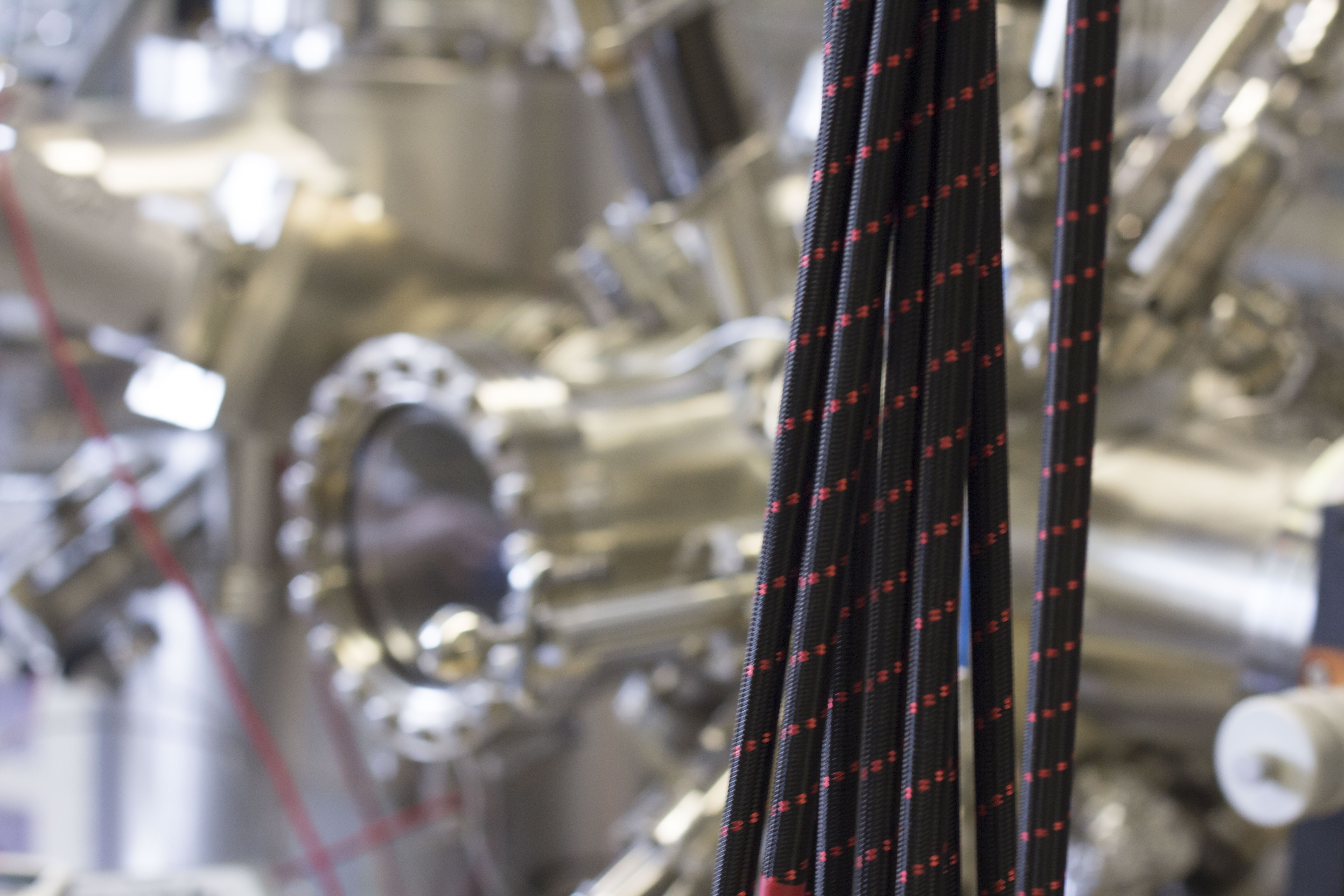 Gelöst wurde das Schwingungsproblem schließlich, indem man das ganze Mikroskop und die Metallkonstruktion, auf der es montiert ist, an die Decke hängte – an Bungeeseilen, deren elastische Eigenschaften besonders gut geeignet sind, niederfrequente Schwingungen zu dämpfen. Sie wurden in einer speziellen, verwinkelten Anordnung befestigt, um verschiedene Schwingungsrichtungen gleichzeitig dämpfen zu können. Die Vorrichtung schwebt etwa zwei Millimeter über dem Boden, dort sind Abstandssensoren angebracht. Ändert sich der Abstand, wird automatisch nachjustiert, indem einer von drei verschiedenen Elektromotoren an zusätzlichen Bungee-Seilen zieht. „Das ist wichtig, weil es während der Experimente zu Gewichtsverlagerungen kommt“, erklärt Michael Schmid. „Wir verwenden flüssigen Stickstoff, um unsere Proben zu kühlen. Der Stickstoffvorrat befindet sich direkt am Mikroskop, wenn er verdampft, wird er leichter – die Gesamtkonstruktion muss aber exakt horizontal bleiben.“