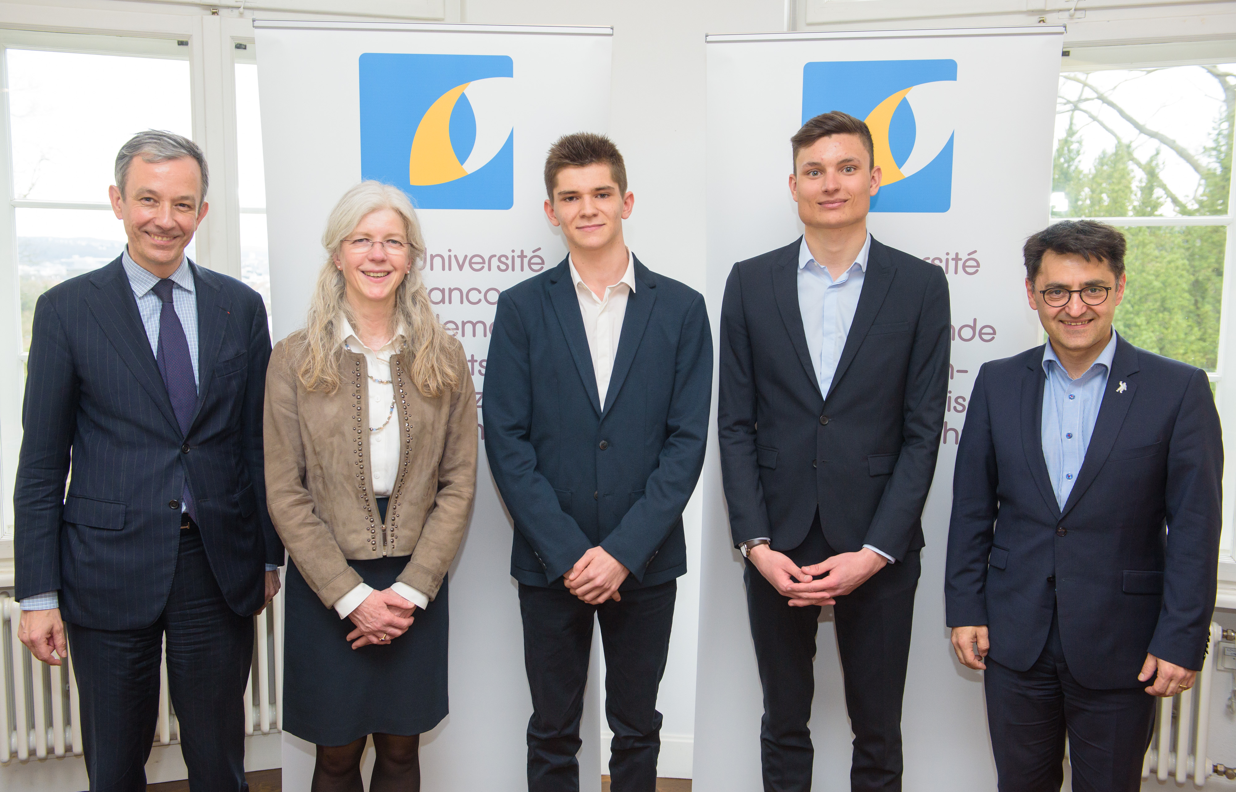 Die zwei französischen Bachelorstudenten Maxime Kleinhans und Theo Bouquet unterzeichneten am 5. April ihre Stipendienverträge in der Villa Europa in Saarbrücken, dem Sitz der DFH.
