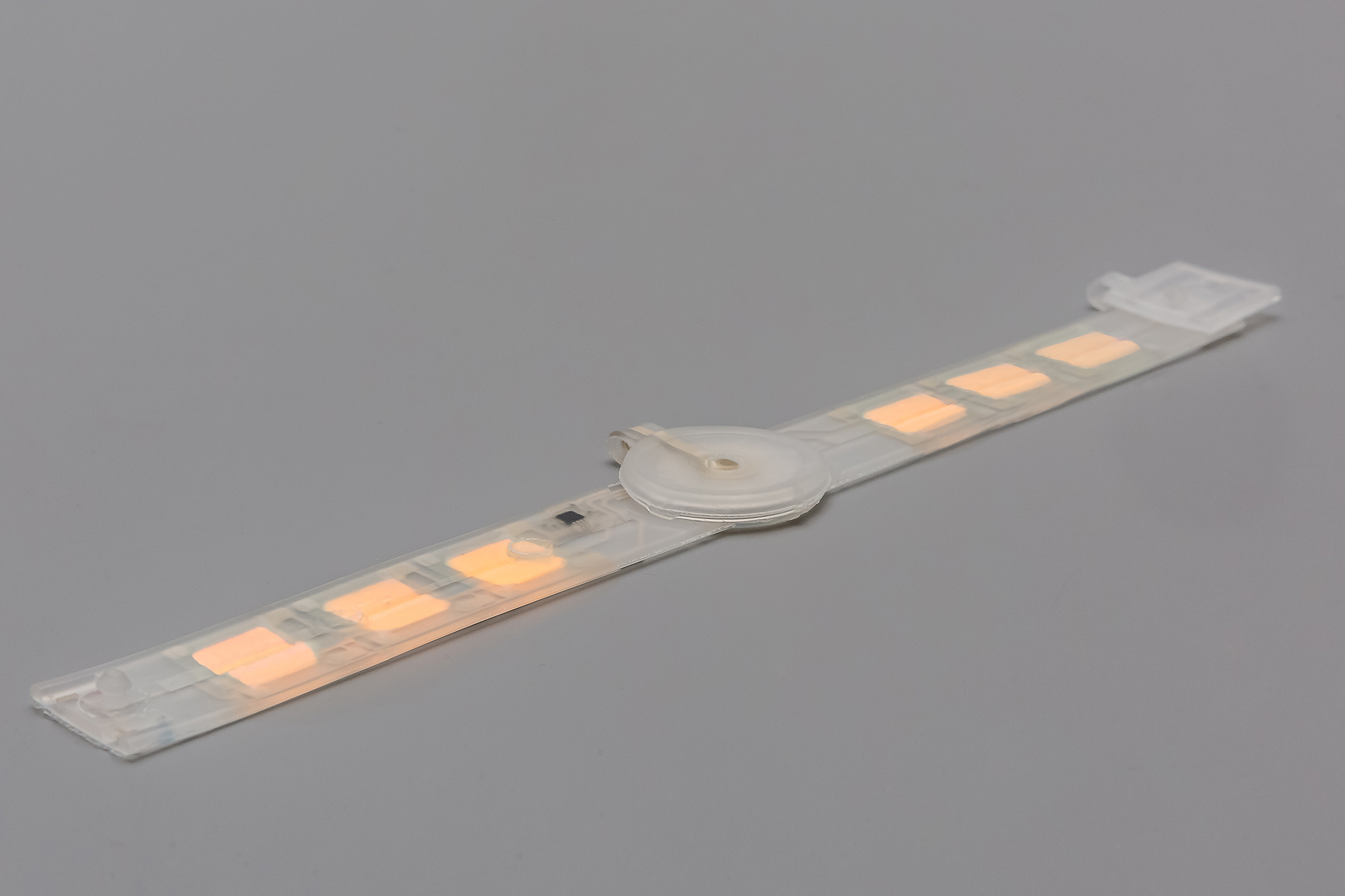 Die finnischen Entwickler von VTT integrierten die fertige OLED in ein neuartiges Armband und entwickelten die kompakte Stromversorgung für das komplette System. Die Herausforderung lag in der Integration der OLED in 3D-Spritzgießteile. Dazu erläutert Markus Tuomikoski von VTT: „Die gelieferten flexiblen OLEDs auf Kunststofffolie konnten wir erfolgreich in ein Armband integrieren. Um den Anforderungen eines tragbaren Bauelementes gerecht zu werden, war die Konzeption und Umsetzung einer kompakten Stromversorgung für die OLED wichtig. Die Verbindung mit flexibler Elektronik mit der OLED innerhalb der Plastikhülle konnten wir dank der gemeinsamen Konzeption und Zusammenarbeit unkompliziert umsetzen.“