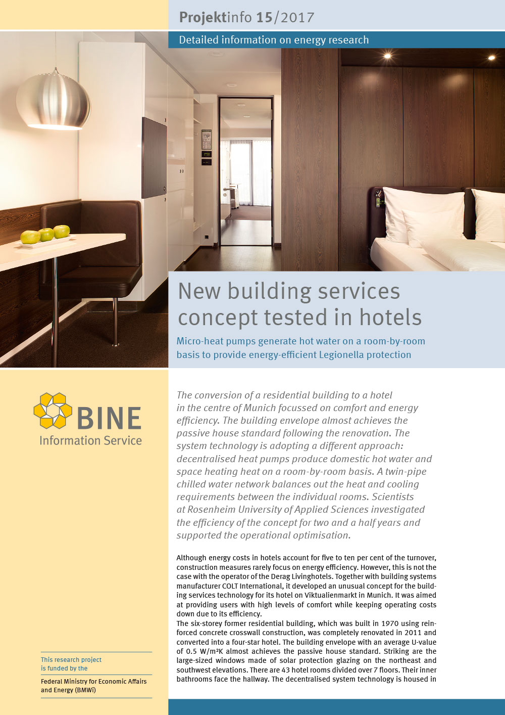 Hotels spend a lot of energy in order to offer their guests the expected amount of comfort. Energy costs therefore account for five to ten per cent of the turnover. In order to combine high comfort with low operating costs, the developers relied on an unusual building services technology concept when converting a building in Munich to become a hotel. The new BINE-Projektinfo brochure entitled “New building services technology concept tested in hotel” presents the technical concept, the results of the monitoring and a survey of the hotel guests. What triggered the concept was the search for energy-efficient protection against Legionella.