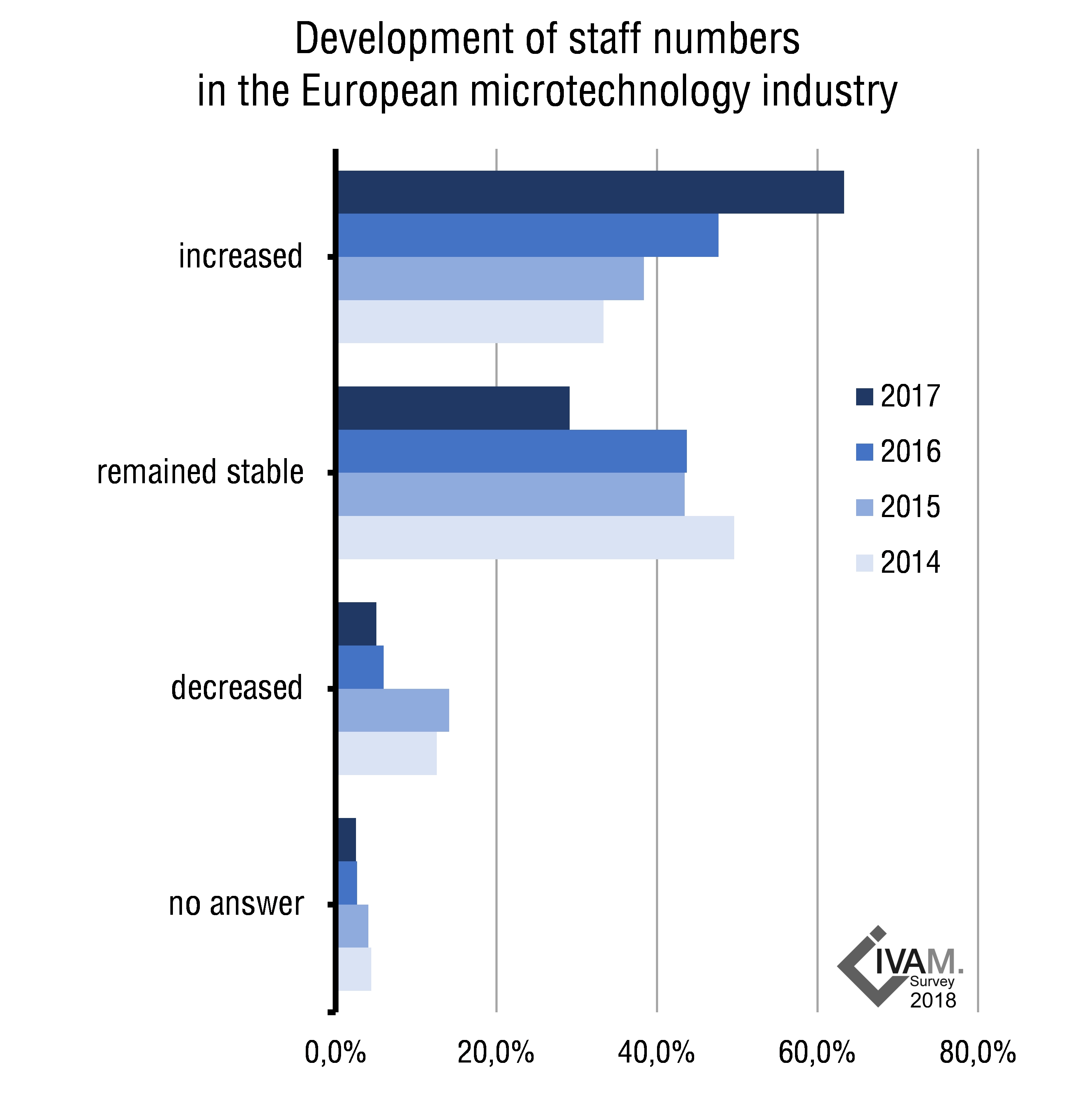 Despite the acknowledged shortage of skilled workers in the STEM fields (science, technology, engineering, and mathematics), the number of employees in the microtechnology industry is steadily rising. In 2017, more than sixty percent of the companies in Europe involved with microtechnology have increased their workforce. In last year’s survey, the companies identified finding enough qualified staff as a major challenge. Expectations for personnel development in the near future are also very positive: more than three quarters of companies intend to hire additional staff within the next three years.