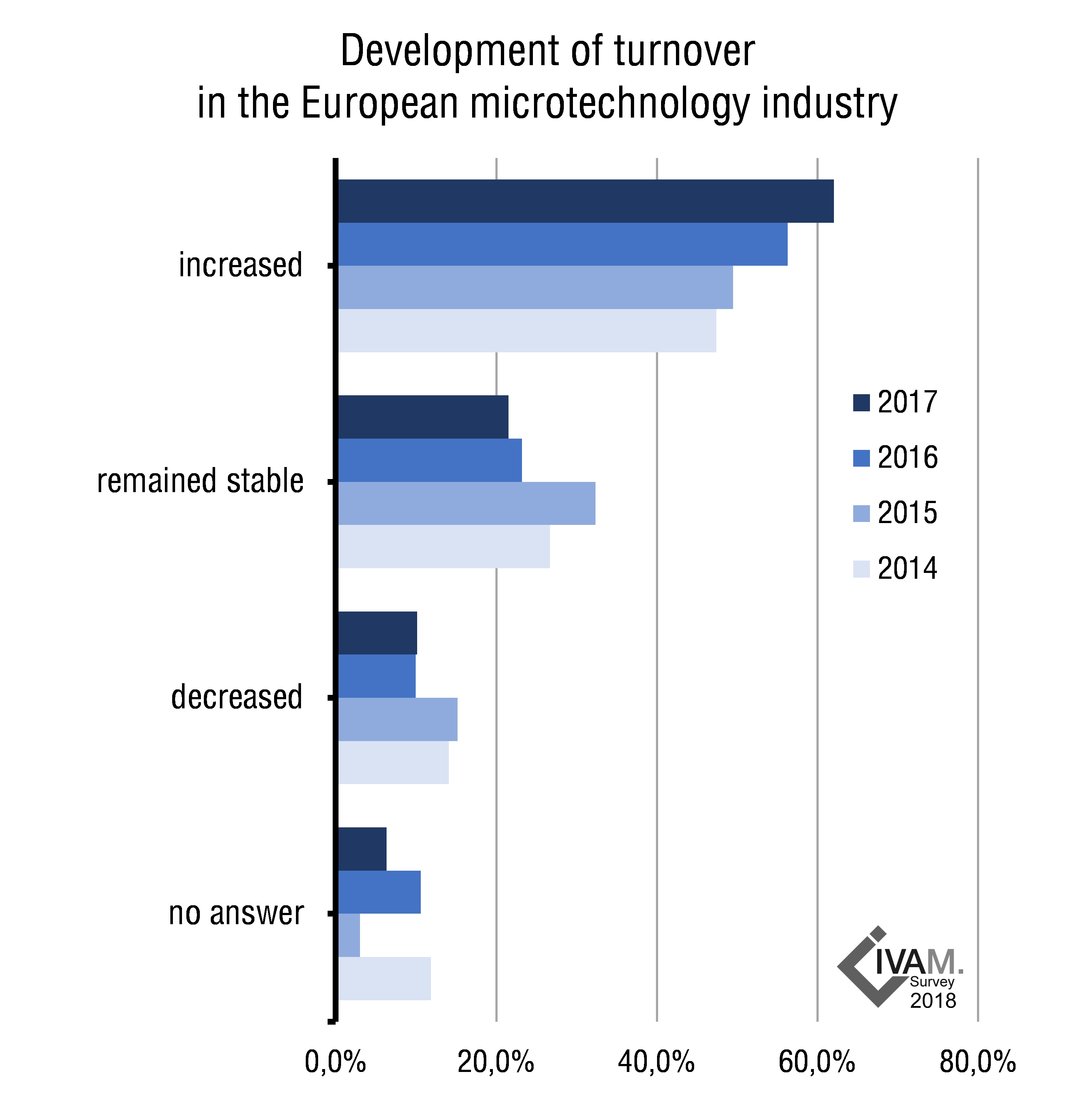 A continuously growing proportion of the European microtechnology companies has been able to increase turnover over the past four years as well. Medium-term expectations are also very positive: nearly eighty percent of companies expect their turnover to increase over the next three years.