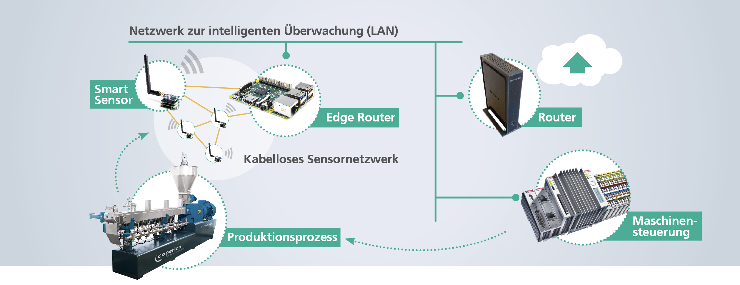 Das am Beispiel eines Doppelschneckenextruders entwickelte Überwachungs- und Optimierungssystem besteht aus intelligenten Sensoren mit integrierter Sensordatenvorverarbeitung sowie einem multifunktionalen Gateway zur Datenaufbereitung und Prozessrückwirkung. Im Rahmen des Forschungsprojektes „ImProcess4.0“identifizierten die Forscher zunächst geeignete Sensorarten und Auswertungsverfahren, die ungünstige Maschinenzustände eines Extruders, wie beispielsweise Verschleißzustände, erkennen sowie Eingriffsmöglichkeiten in die Prozesssteuerung. Daraus leiteten sie Anforderungen an die Konfiguration der intelligenten Sensorknoten ab und definierten eine Systemarchitektur, Anwenderschnittstellen, Datenprotokolle und Datenformate. Über standardisierte Schnittstellen soll eine einfache, nachträgliche Integration in bestehende Unternehmensnetzwerke ermöglicht werden (Retro-fitting).