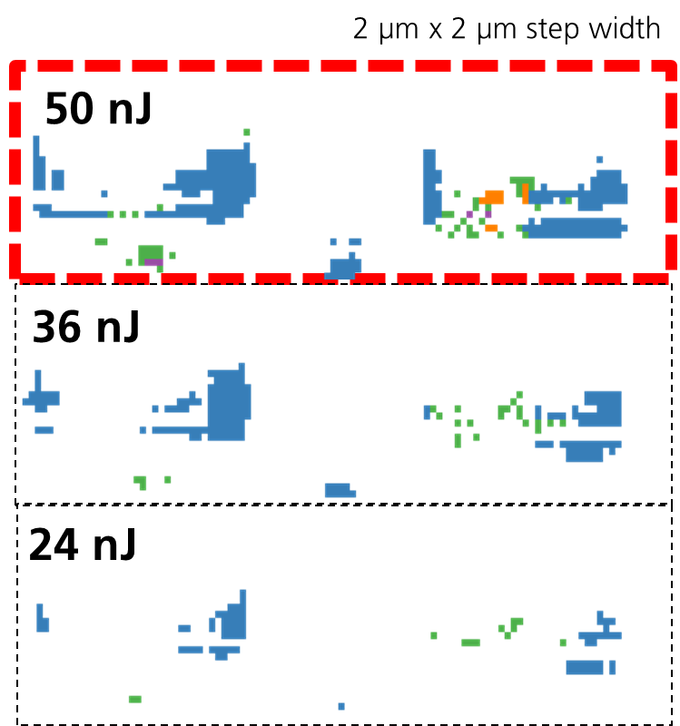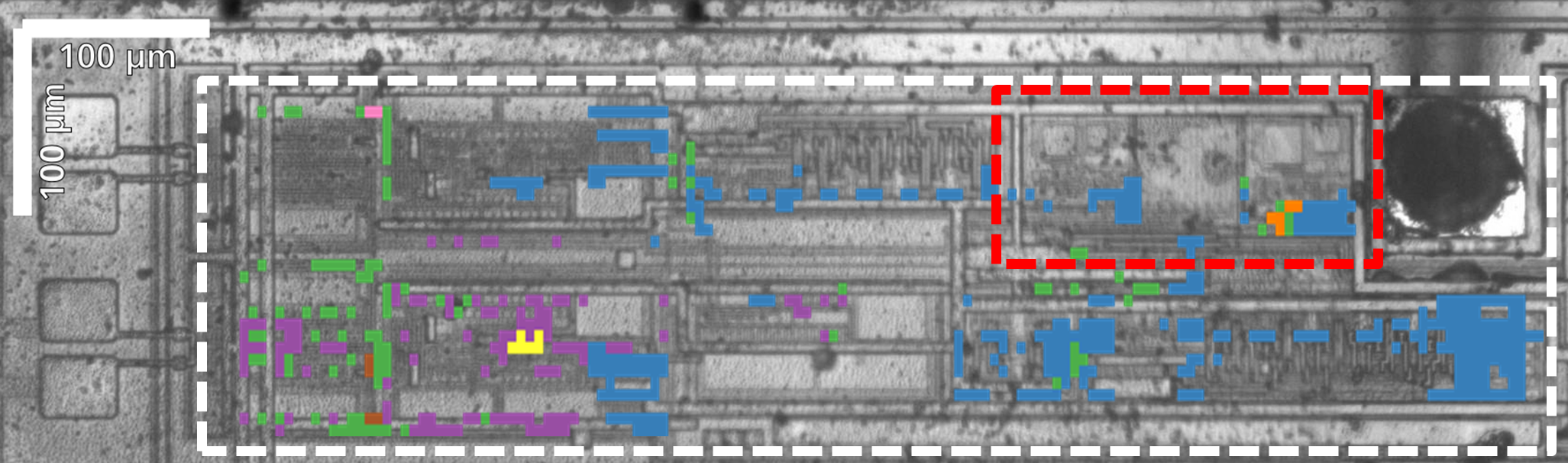 Teilchen kosmischer Strahlung aus dem Weltraum können in elektronische Bauteile einschlagen und temporäre oder dauerhafte Fehlfunktionen herbeiführen. Mittels eines Pikosekundenlasers werden diese so genannten Single Event Effects (SEEs) am Fraunhofer INT simuliert und untersucht. Die Untersuchungen zeigten Regionen auf einem elektronischen Bauteil, welche unter Laserbeschuss einen erhöhten Stromfluss, einen Single Event LatchUp (SEL), aufwiesen. Ohne Schutzmaßnahmen können diese SELs dazu führen, dass ein Bauteil durchbrennt und funktionsunfähig wird (Abb. 1 SELs in blau). Es konnte außerdem die genaue räumliche Verteilung von verschiedenen kurzzeitigen Störungen (Transienten) lokalisiert werden, welche zu Fehlern im Bauteil führen können (Abb. 2). Sämtliche SELs sowie einige der Transienten wurden bei vergleichbaren Schwerionentests nicht beobachtet.