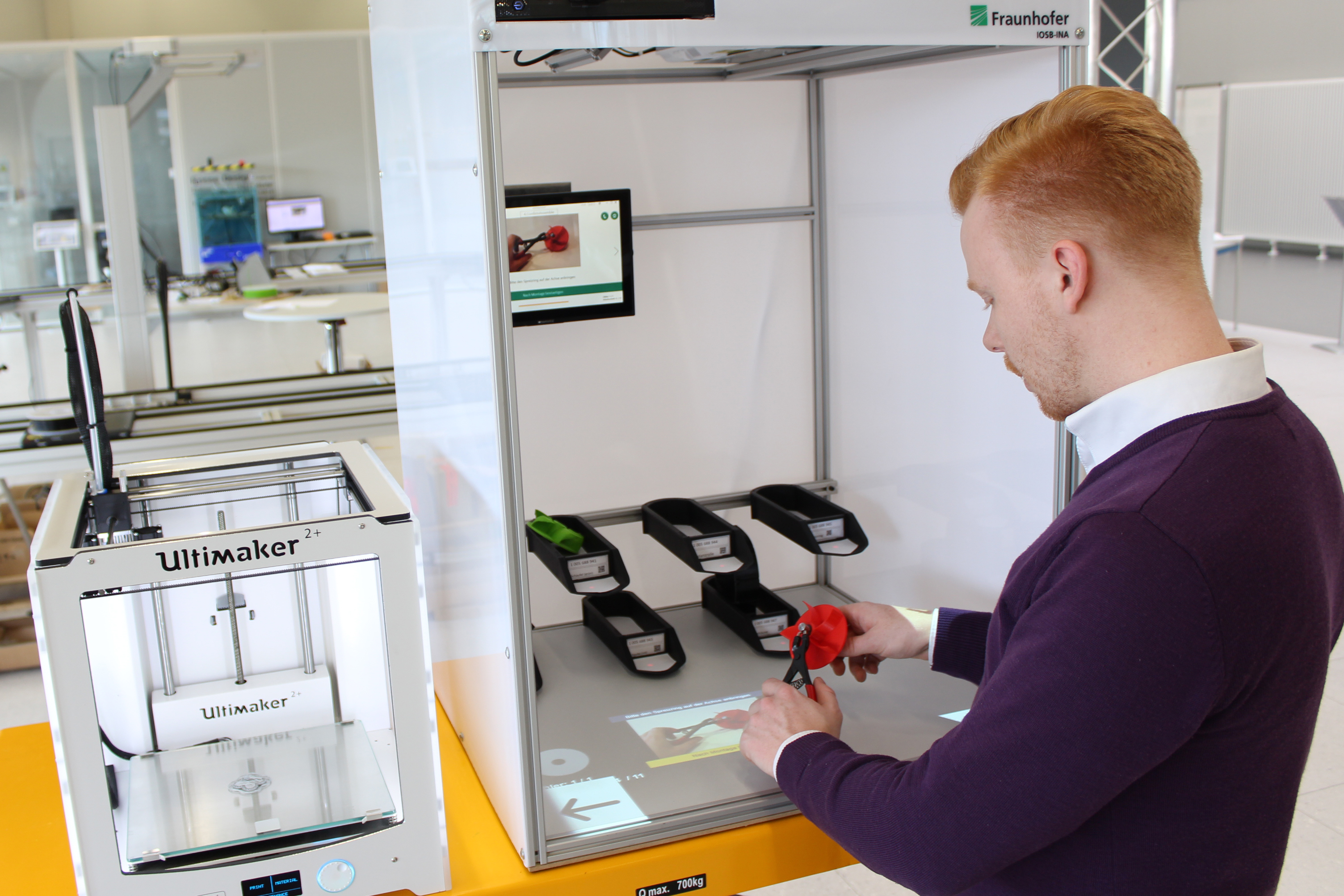 Intelligente Assistenzsysteme unterstützen den Werker interaktiv bei einem Montagevorgang und leiten ihn beispielsweise über Projektionen oder Datenbrillen durch die Arbeitsschritte. http://ciit-owl.de/CIIT-Share/index.php/s/y8Qp1zcQZ8Y1qIb (Bildquelle: Fraunhofer IOSB-INA)