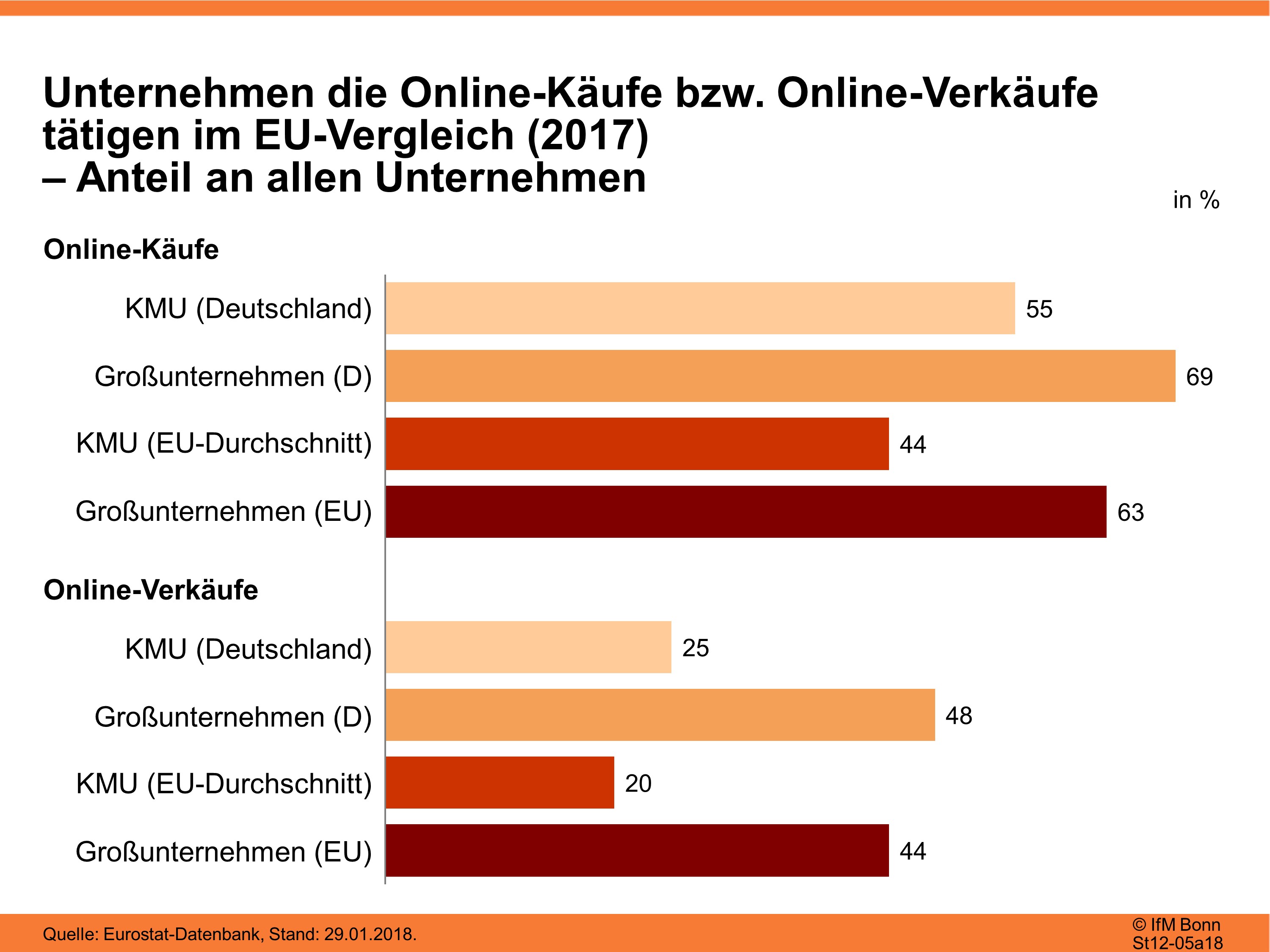 55 % aller in Deutschland ansäßigen KMU kaufen zwar Waren über das Internet ein, jedoch nur 25 % haben diesen Absatzweg auch für sich erschlossen. Dabei ist inzwischen fast jedes kleine und mittlere Unternehmen mit einer eigenen Webseite im Internet präsent.