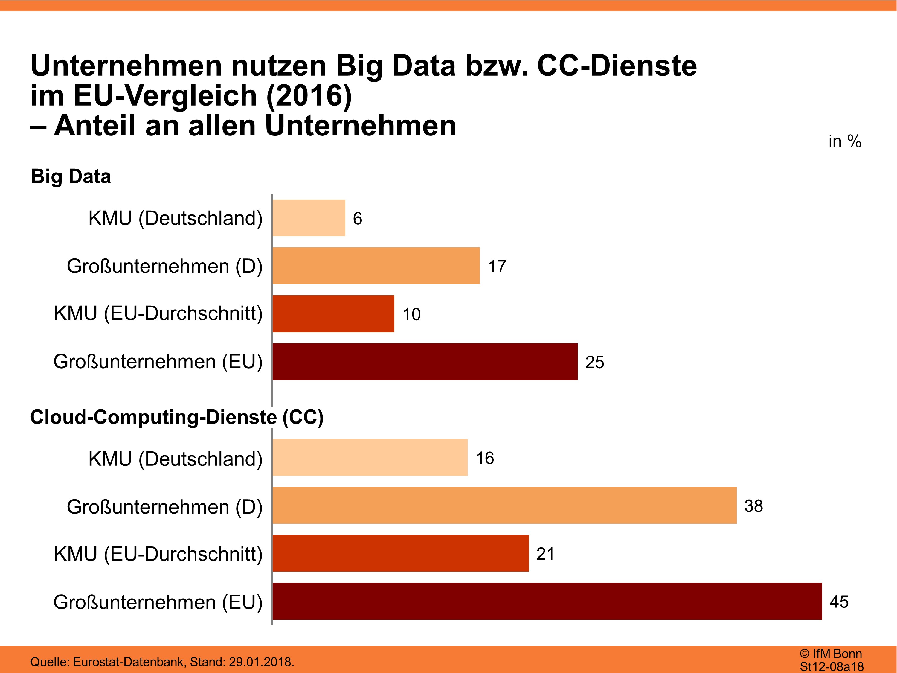 Im Gegensatz zu den Unternehmen des US-amerikanischen Silicon Valleys und zu den kleinen und mittleren Unternehmen (KMU) in den anderen EU-Staaten ziehen die KMU in Deutschland deutlich seltener wirtschaftlichen Profit aus den digitalen Möglichkeiten: So werten nur 5 % von ihnen die gesammelten Kundendaten systematisch aus – im EU-Durchschnitt nutzen 10 % diese Datenmengen. Unter den Großunternehmen in Deutschland analysieren 17 % Big Data.