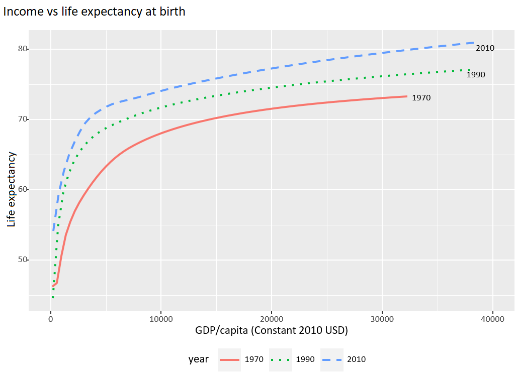 In 1975, Samuel Preston developed the Preston Curve, which plotted the GDP per person on the horizontal axis against life expectancy on the vertical axis. The curve shows a clear but flattening upward trend in life expectancy with increasing GDP. The curves also shift upwards over time which has been explained by better healthcare.