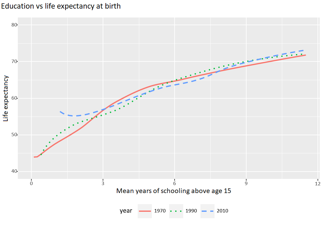Lutz and Kebede also plotted life expectancy against the mean years of schooling of the adult population. The curve created is much more linear, suggesting that education is a much better predictor. There is no upward shift of the curve requiring explanation by other factors. Data was subject to multivariate analyses to validate the findings. The same link was found when the curves were adjusted for child mortality.