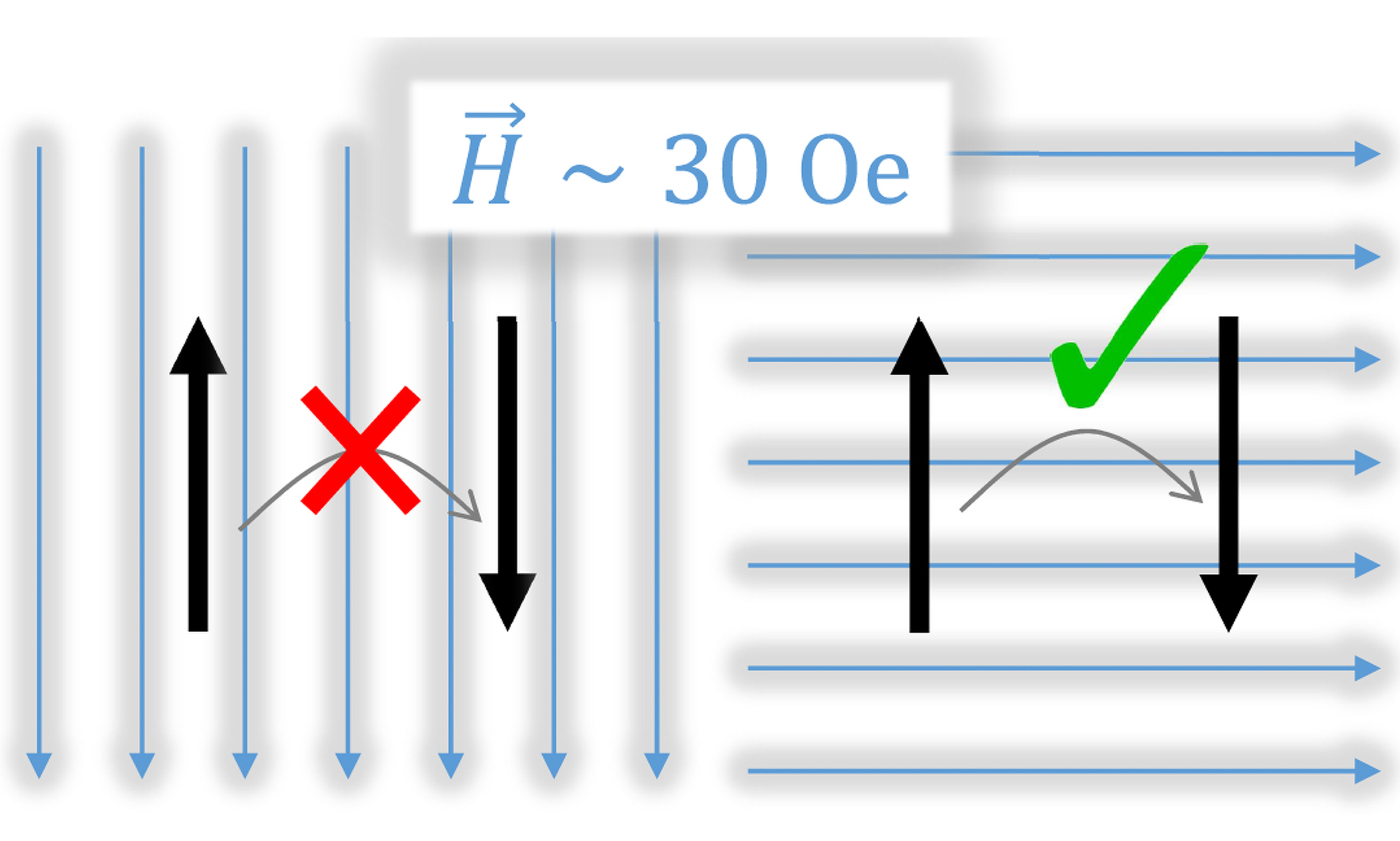Doch nicht nur das Unterdrücken des quantenmechanischen Tunneleffektes ist gelungen, auch das Gegenteil hat sich möglich erwiesen: Legt man des externe Magnetfeld entlang bestimmter Richtungen an, nämlich senkrecht zur gedachten Linie zwischen Eisen und seinen zwei Nachbaratomen, so kann die Tunnelrate sogar signifikant erhöht werden. Man kann das magnetische Moment somit entweder einfrieren oder sein Umklappen gezielt befördern.