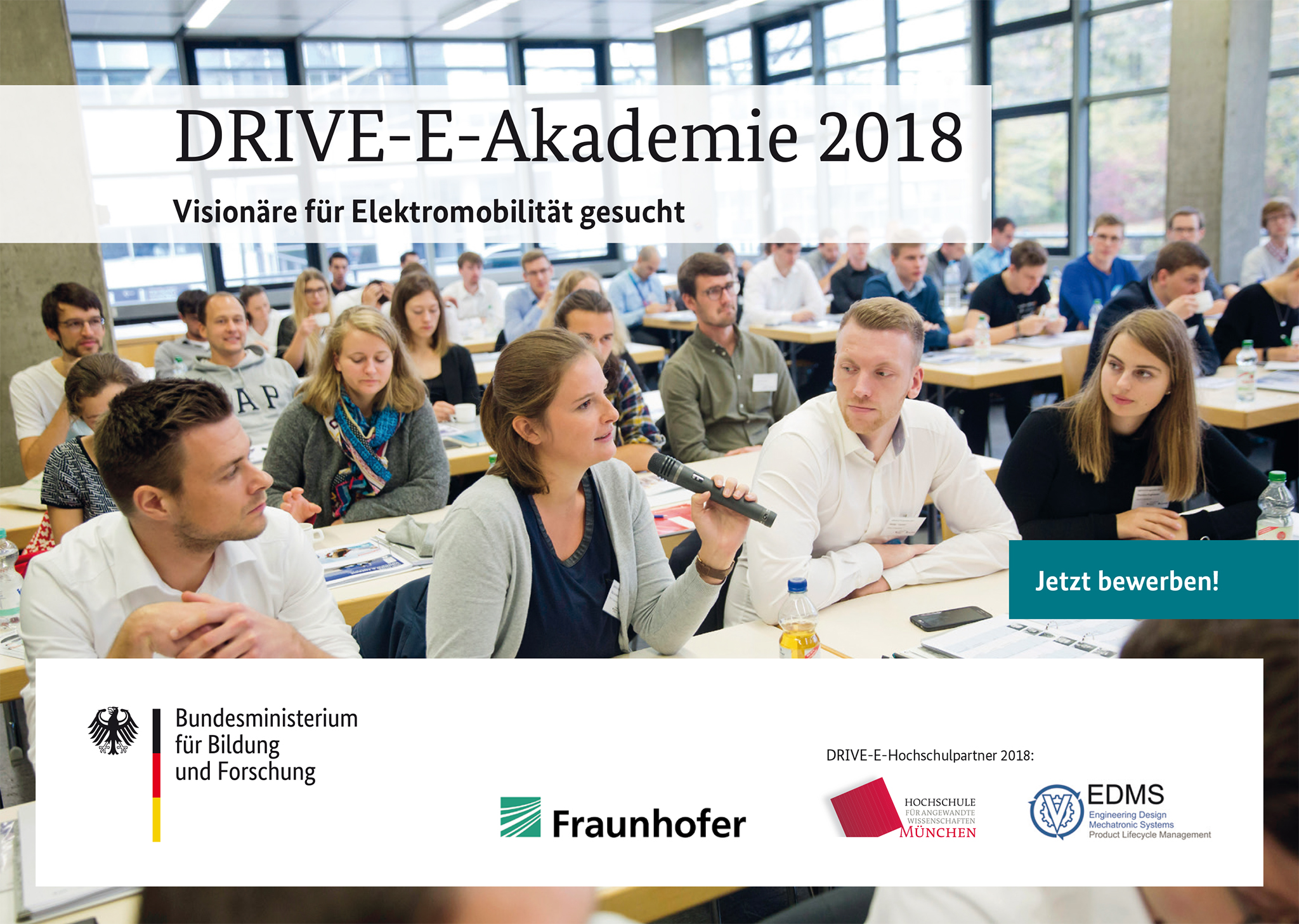 Ab sofort und bis zum 15. Juni 2018 können sich Studierende aus ganz Deutschland für die Teilnahme an der DRIVE-E-Akademie oder für einen der DRIVE-E-Studienpreise bewerben. Weitere Informationen und das Bewerbungsformular gibt es online unter https://www.drive-e.org.