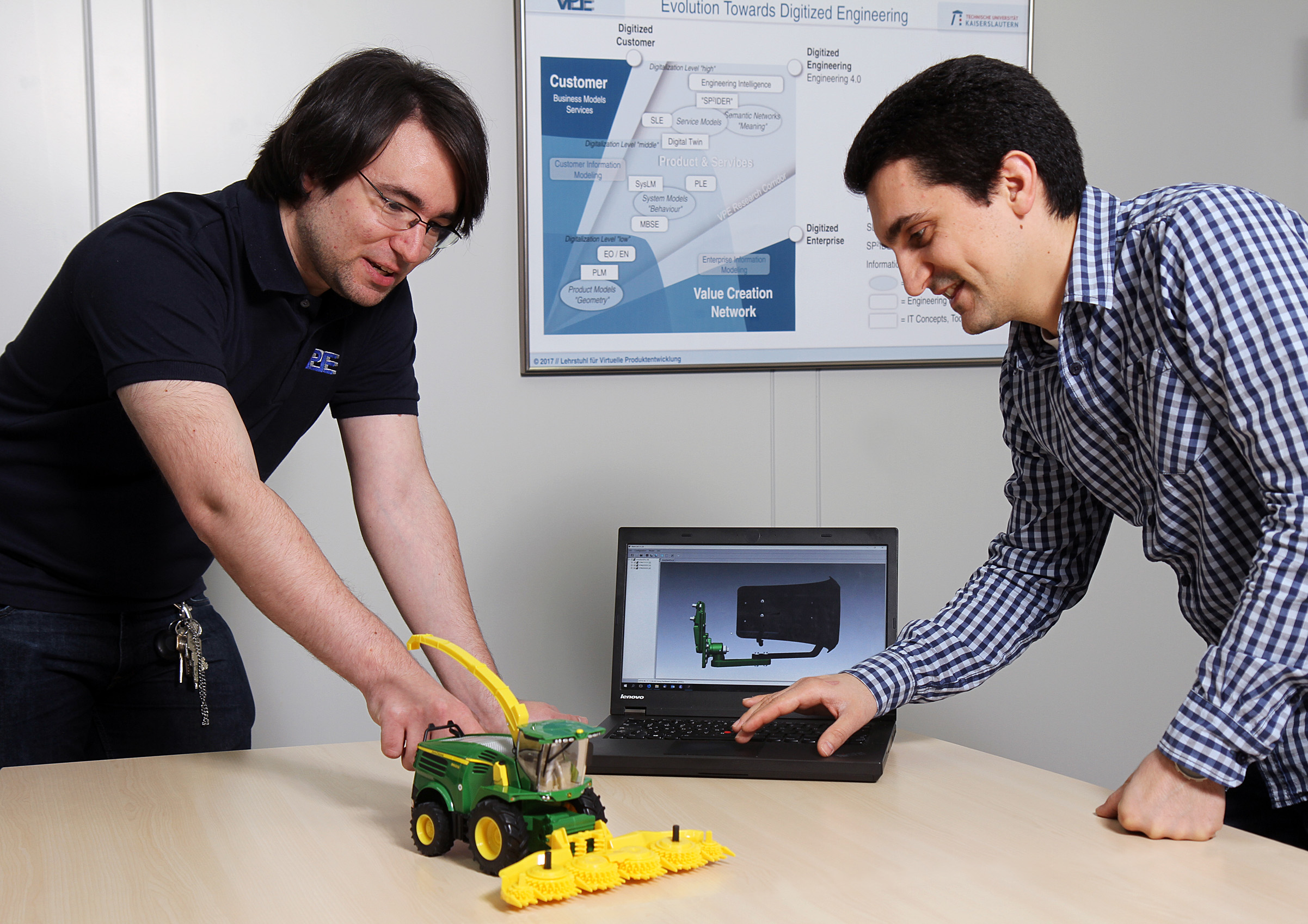 Auch wichtig, um solche verfügbarkeitsorientierten Geschäftsmodelle zu realisieren, ist ein sogenannter „digitaler Zwilling“ der Landmaschinen, den die Kaiserslauterer Forscher ebenfalls entwickeln. „Bei Traktoren und anderen Maschinen gibt es unzählig viele Variationsmöglichkeiten, je nach Bedarf der Landwirte können sie mit verschiedenem Zubehör ausgestattet sein“, sagt Eickhoff weiter. „Kommt es zu einem Ausfall, muss schnell Ersatz her. Dies ist aber nur möglich, wenn man ganz genau weiß, welches Teil wo verbaut ist.“ Mit dem digitalen Zwilling wollen die Forscher alle notwendigen Daten von einzelnen Bauteilen bis hin zu Reparaturanleitungen in einer Datenbank digital hinterlegen. Dafür entwickeln sie ein intelligentes Informationsmanagement-System, in dem alle wichtigen Informationen zu den Maschinen nutzerfreundlich zusammengestellt sind. „Es fallen große Datenmengen an, etwa die der Sensoren, die ausgewertet und beurteilt werden müssen und zum Beispiel automatisiert an einen Servicetechniker gesandt werden sollen“, so Apostolov weiter. Mit dem System sollen die Hersteller künftig einfacher den Überblick behalten, um zum Beispiel vorzeitig von einem Ausfall zu erfahren. Servicetechniker wissen damit zudem schnell, um welche Art von Maschine es sich handelt, welche individuelle Konfiguration sie hat und welche Ersatzteile entsprechend benötigt werden.