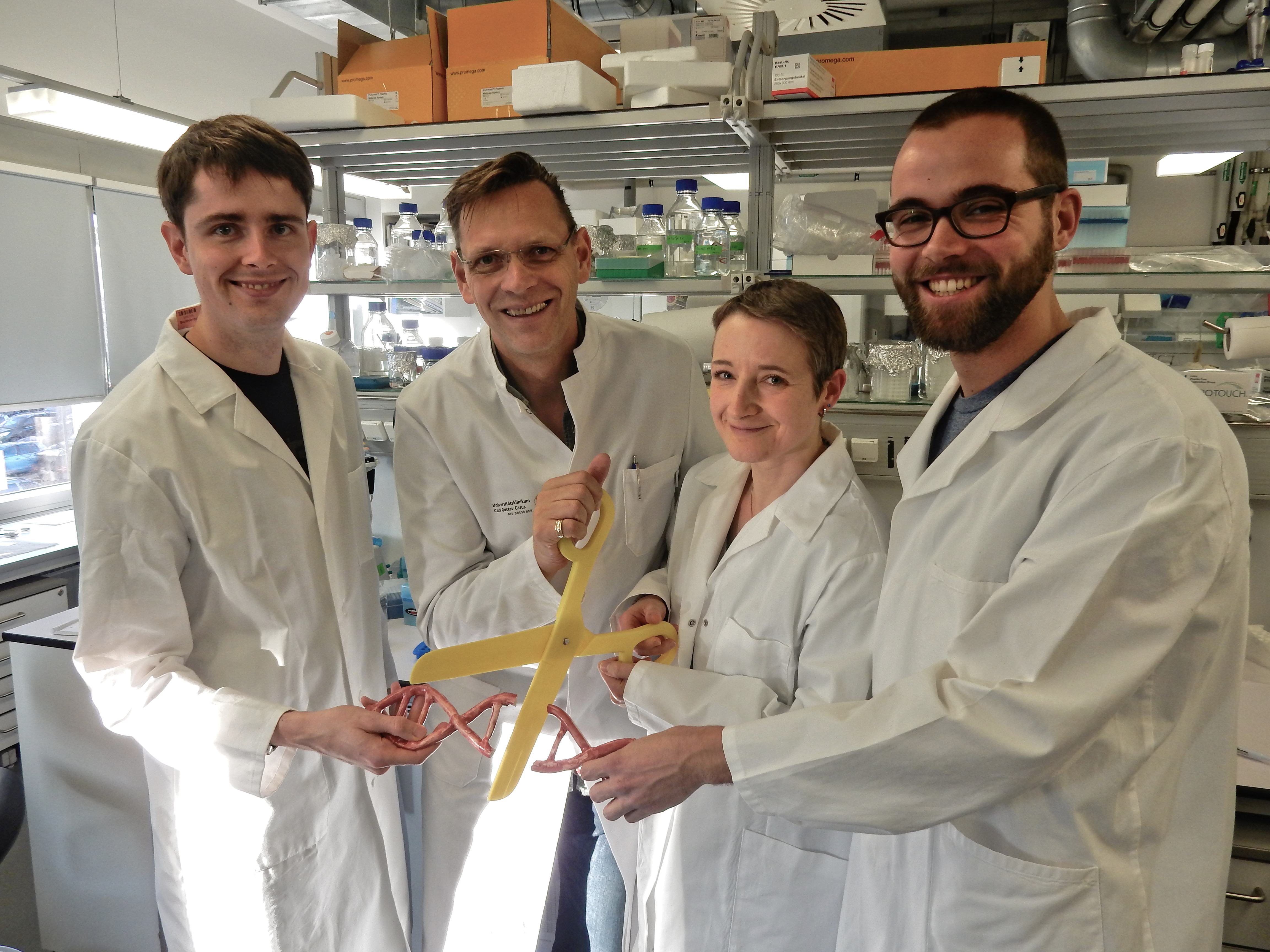 „Unsere Technologie schneidet das Genom nicht nur sehr präzise, sondern kann auch die beiden Schnittstellen wieder zusammenfügen“, erläutert Frank Buchholz die Vorteile seiner Methode. „Das ist ein wichtiger Unterschied zur derzeit heiß diskutierten CRISPR/Cas-Technologie, die sich für das Zusammenfügen auf die zellinternen Reparaturmechanismen verlassen muss und damit fehleranfällig ist.“