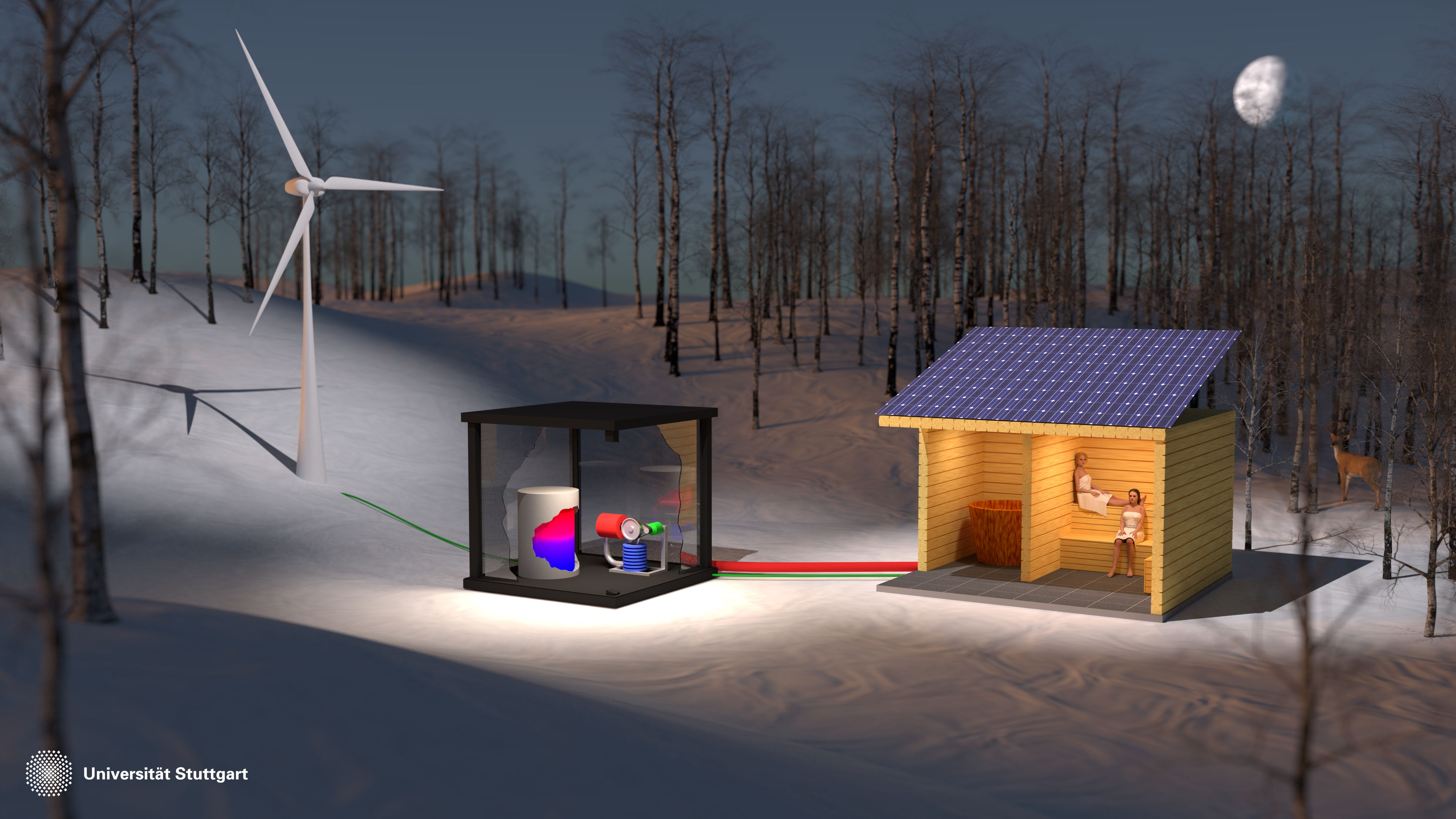 Doch Sauna ist nicht gleich Sauna: Während Europäer es überwiegend heiß und trocken mögen (Finnische Sauna), wird im Orient das Dampfbad (Hamam) bevorzugt, in dem eine höhere Luftfeuchtigkeit und niedrigere Temperaturen herrschen. Gleichzeitig ist in Europa eine hohe Verfügbarkeit an Windenergie gegeben, während im orientalischen Raum Sonnenenergie nahezu unbegrenzt verfügbar ist. Für beide Saunavarianten und Standorte hat das Institut für Energiespeicherung der Universität Stuttgart in Kooperation mit dem Institut für Technische Thermodynamik des DLR mögliche Konzepte erarbeitet.