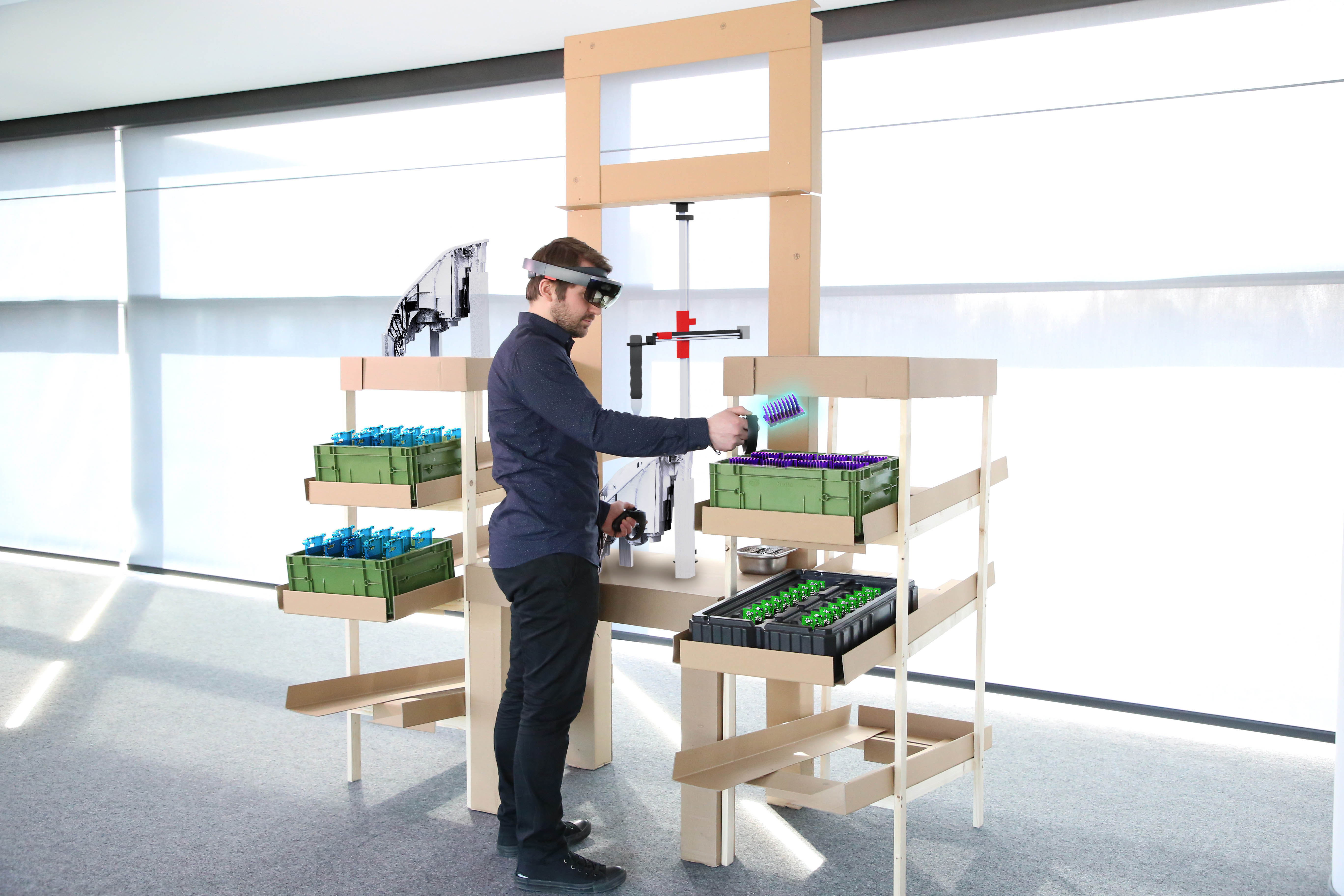 Ist die Arbeitsfläche in der richtigen Höhe eingestellt? Gibt es ausreichend Platz für Arm- und Handbewegungen? Hat der Monteur alle Werkzeuge und Bauteile im Blick und in greifbarer Nähe? Für jede Scheinwerfergeneration plant das HELLA Entwicklerteam einen neuen Montagearbeitsplatz, um etwa die Produktionsabläufe bestmöglich festzu-legen. Lange bevor der neue Scheinwerfer vom Band läuft, wird der Arbeitsplatz zu-nächst als sogenannter Mock-Up aus Pappe gebaut und dann im Team diskutiert und geprüft. Zu diesem frühen Zeitpunkt fehlt oft noch das Wichtigste: die realen Bauteile des Scheinwerfers und zugehörige Werkzeuge.