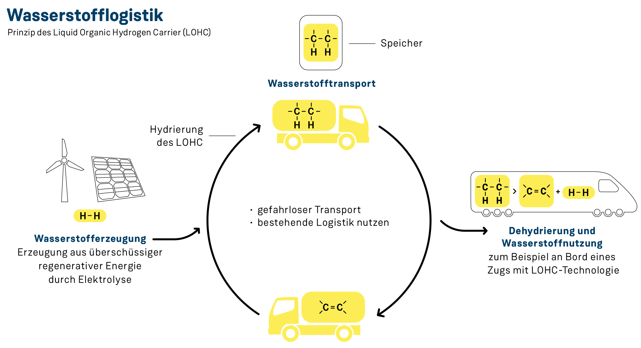 Die organische Trägerflüssigkeit („Liquid Organic Hydrogen Carrier“) dient den Forschern als eine Art flüssige Pfandflasche für Wasserstoff. Schon ein einziger Liter bindet über 650 Liter Wasserstoff. Von ihrer Handhabung und den physikalischen Eigenschaften her ist die ölige Substanz üblichen Kraftstoffen recht ähnlich und lässt sich mit Tanklastern und Zügen einfach transportieren. Im Prinzip lassen sich so auch Wasserstoff-Tankstellen mit Wasserstoff beliefern, an denen dann Wasserstoffzüge wie der kurz vor der Zulassung stehende Coradia iLint der Firma Alstom betankt werden können. Doch in ihrem Projekt gehen die Forscher des HI-ERN noch einen Schritt weiter: