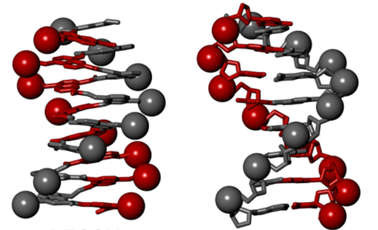 Darstellung einer Doppelhelix (rechts) und einem Imitat (links), bestehend aus einem einzelnen Helixstrang, auf dessen Oberfläche zwei Netze negativer Ladungen (graue und rote Bereiche) so aufgebracht sind wie die negativen Ladungen der beiden DNA-Stränge