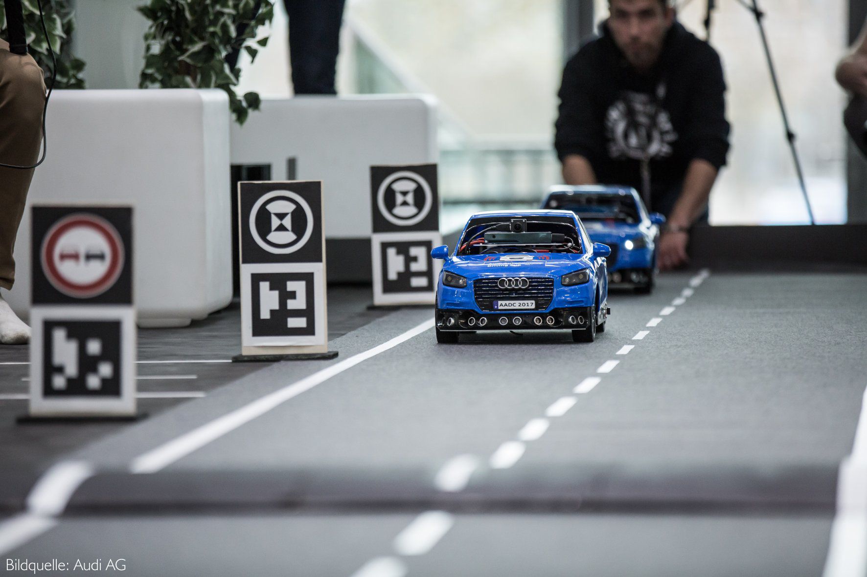 Im Mittelpunkt der Präsentation der TU Ilmenau steht das Thema autonomes Fahren. Ein Wissenschaftlerteam des Fachgebiets „Simulation und Optimale Prozesse“ um Professor Pu Li zeigt, wie Hightech-Modellautos mit Hilfe selbst lernender Algorithmen autonom, also ohne das Eingreifen von Menschen während der Fahrt, selbst schwierige Verkehrssituationen wie Abstand halten oder das plötzliche Erkennen von Hindernissen zuverlässig bewältigen. Die online berechnete Strategie zur Bewältigung bestimmter Aufgaben ist sicherer und weni-ger störanfällig als konventionelle Verfahren. Um dies zu erreichen, entwickelten die Forscher ein Optimierungsverfahren, das die Umgebungsbedingungen ebenso berücksichtigt wie die Fahrzeugdynamik und die Wünsche von Fahrzeuginsassen. Das Konzept kann leicht auf reale Fahrzeuge übertragen werden und ist daher für die Autoindustrie überaus interessant. Mit seiner Entwicklung gewann das Team der TU Ilmenau im vergangenen Jahr den Audi Autonomous Driving Cup, einen internationalen Wettbewerb, dessen Ziel die Realisierung vollautomatischer Fahrfunktionen und der dafür notwendigen Softwarearchitekturen ist.