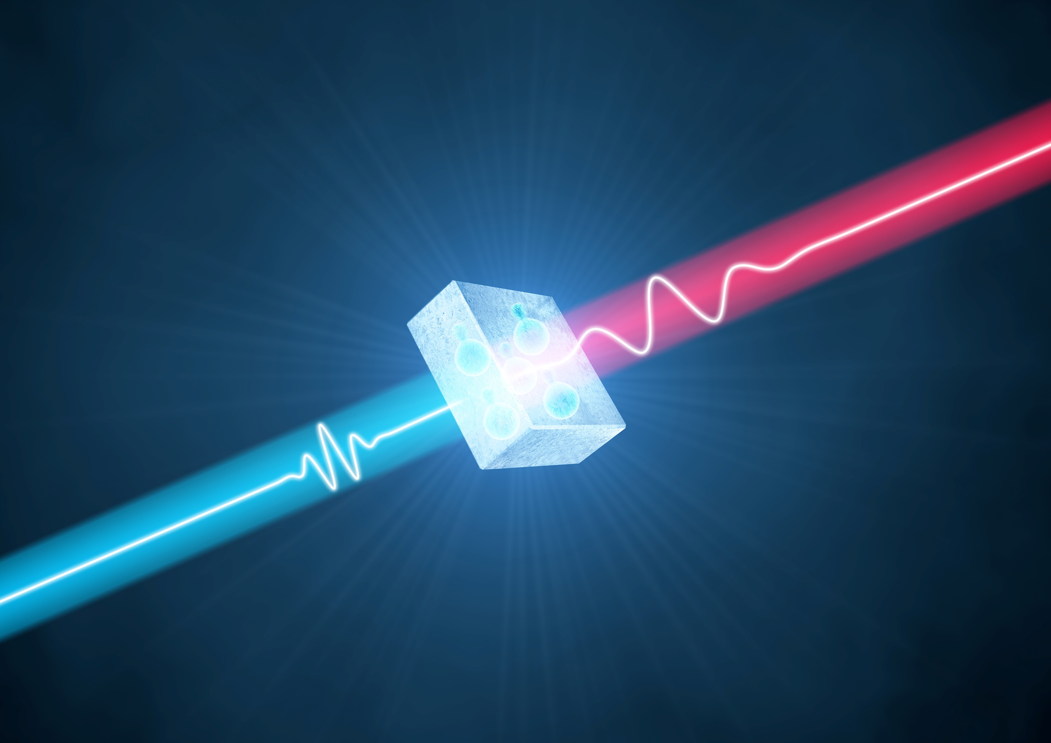 An artistic view of frequency conversion from near-infrared to mid-infrared through a nonlinear crystal. Shortwave radiation enters a crystal and drives electron motion. The electrons cannot fully follow the frequency of the light field and partially oscillate at lower frequencies. In this way mid-infrared radiation is generated. (Copyright: Alexander Gelin)