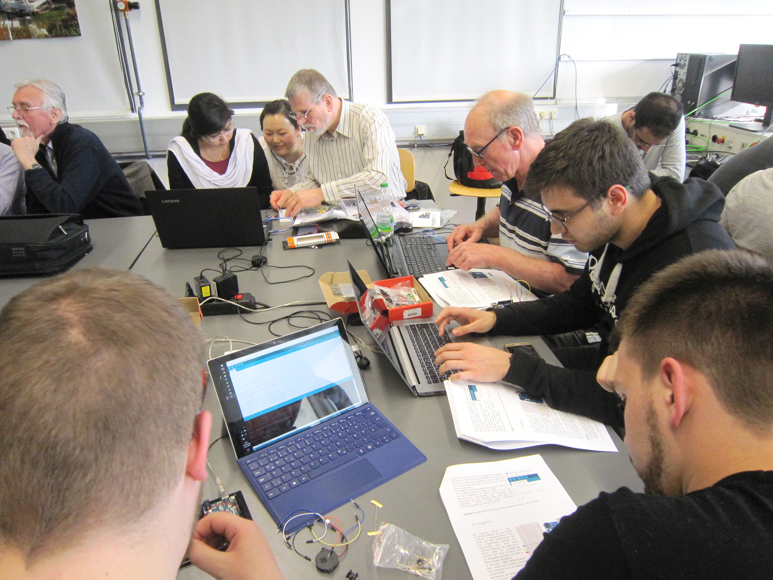 „Die Sprache von Mathematik und Physik ist weltweit gleich“, so Prof. Dr. Johannes Stolz, der das Projekt im Herbst letzten Jahres ins Leben gerufen hat. Mit dem Kurs versuche man, über mathematische und physikalische Abhängigkeiten eine Verbindung zur Sprache zu schaffen. Lernen findet im Kurs daher weniger durch Erklären als vielmehr durch die eigene Erfahrung beim Experimentieren statt. Der Professor aus der Fachrichtung Elektrotechnik und Informationstechnik denkt sich dafür gemeinsam mit seinem studentischen Team immer wieder neue, spannende Versuche aus – vom Löten über den Bau von Cola-Dosen-Motoren, Smartphone-Ladegeräten, Elektromotoren, Lauflichten oder Spurhalterobotern bis hin zu Untersuchungen an Photovoltaik-Modulen und Elektromagneten.