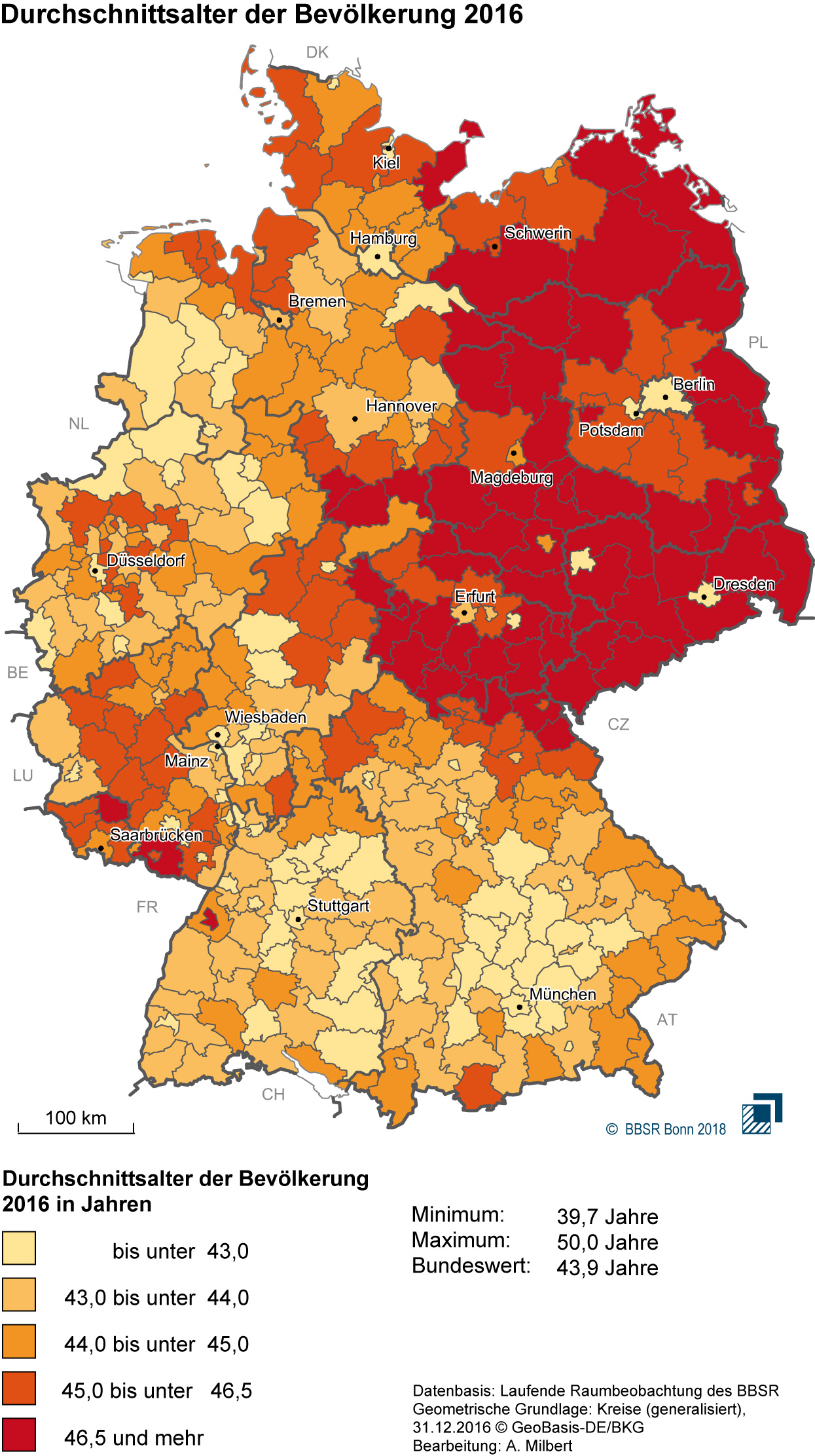 • Karte: Durchschnittsalter der Bevölkerung 2016