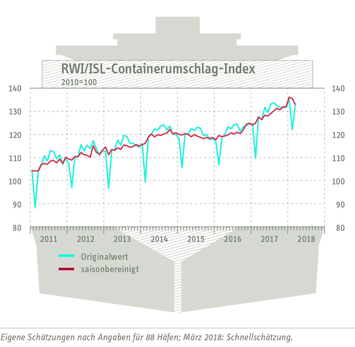 Der Containerumschlag-Index des RWI – Leibniz-Institut für Wirtschaftsforschung und des Instituts für Seeverkehrswirtschaft und Logistik (ISL) ist im März 2018 gegenüber dem Vormonat deutlich von (revidiert) 135,5 auf 133,0 zurückgegangen. Unklar ist, inwieweit darin bereits erste Folgen des raueren handelspolitischen Klimas zwischen den USA und China sichtbar werden. Auffällig ist, dass der Umschlag in den Häfen an der Pazifikküste der USA und in einigen chinesischen Häfen im März gesunken ist. Allerdings sind die Daten derzeit unsicherer als üblich. Die Werte für Januar und Februar wurden deutlich nach oben korrigiert, jedoch fehlen immer noch Angaben für eine ungewöhnlich große Zahl von Häfen.