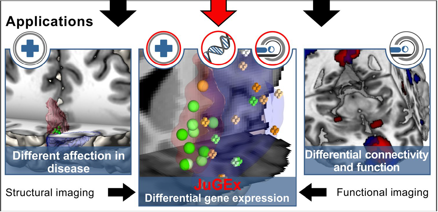 Ihr Team hat dafür nun JuGEx entwickelt. Das frei verfügbare Tool ermöglicht es, genetische Daten aus dem Allen Brain Atlas mit den mikrostrukturellen Karten von JuBrain zu verknüpfen. „Unser Ansatz macht es sehr einfach, zu testen, welche Gene in frei wählbaren Hirnregionen unterschiedlich stark exprimiert sind“, so Thomas Mühleisen, Genetiker am Forschungszentrum Jülich. Zusammen mit dem Neuroanatom Sebastian Bludau leitete er die Entwicklung von JuGEx. „Wenn man sich für Merkmale des Gehirns interessiert, die zum Beispiel durch strukturelle Magnetresonanztomografie identifiziert wurden, können wir die Genexpression, sprich die Aktivität von Genen, in dieser Region jetzt mit hoher räumlicher Genauigkeit untersuchen“, erklärt Mühleisen.