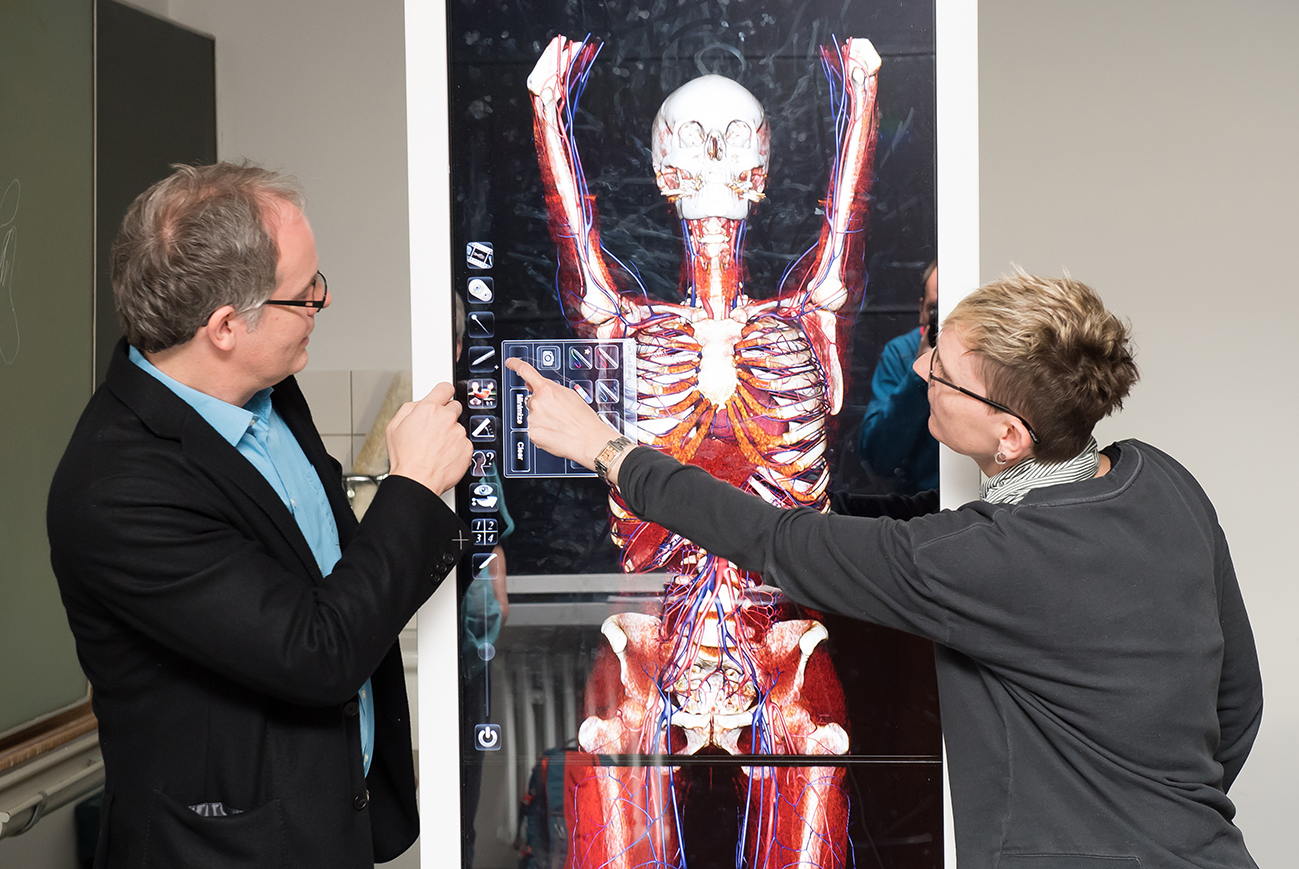 Die Hightechgeräte zeigen die lebensgroße dreidimensionale Darstellung eines Menschen, die an beliebigen Stellen geschnitten und – anders als bei einer realen Präparation – virtuell von allen Seiten betrachtet werden kann. Mit Touch-Screen und über ausgewählte Tools lassen sich beliebige anatomische Details anzeigen. Die 3D-Darstellung bietet einen Überblick über die Lage von Organen, Blutgefäßen und Nervenfasern im menschlichen Körper.
