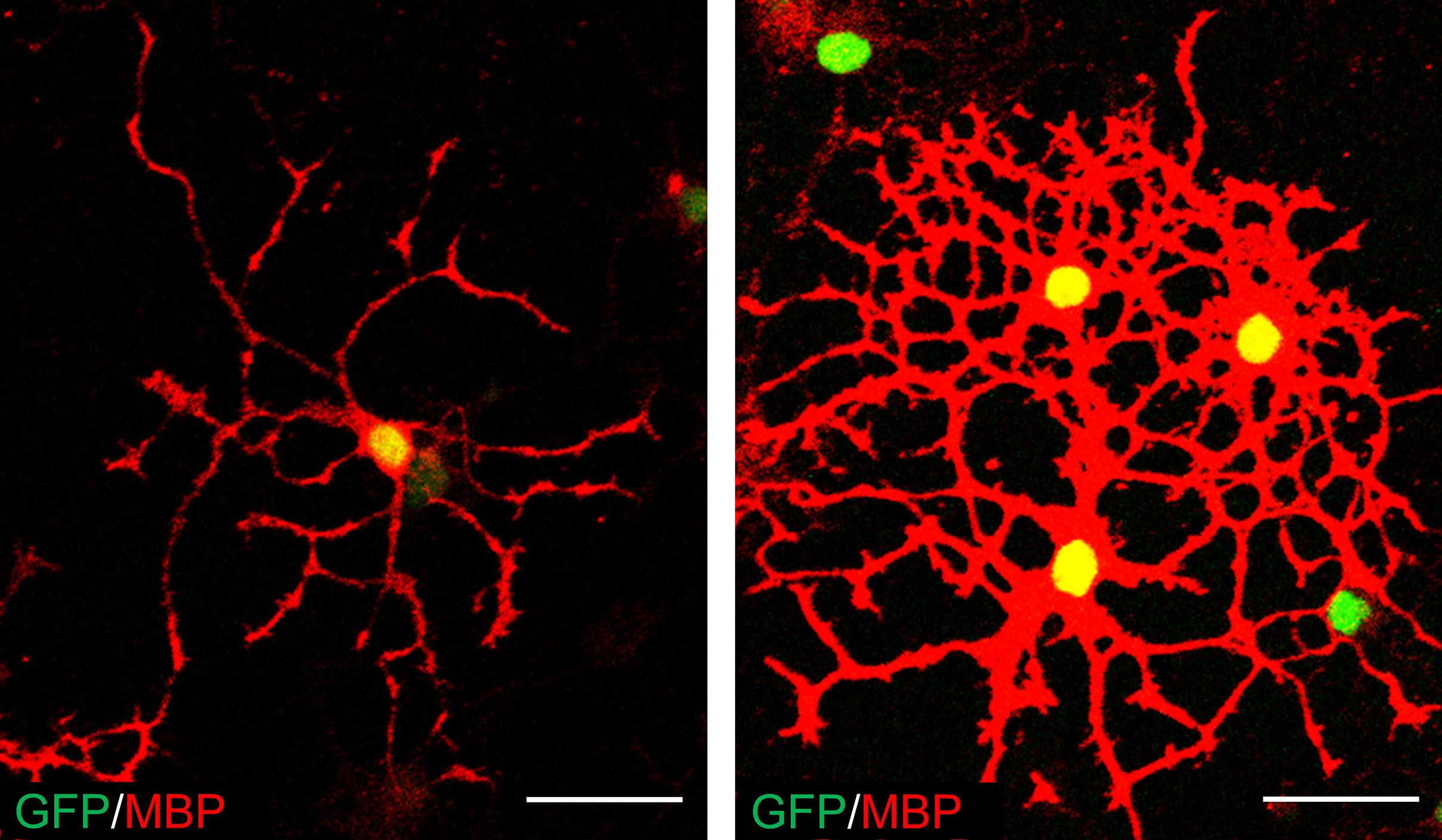 Die Forscher möchten dazu bestimmte Zellen im Gehirn nutzen, die Oligodendrozyten. Diese ähneln einem mikroskopisch kleinen Kraken: Von ihrem Zellkörper gehen sehr viele lange Ärmchen aus, die größtenteils aus Myelin bestehen. Wie ein Isolierband wickeln sich diese bei der Entwicklung des Gehirns um die Nervenzell-Fortsätze. Normalerweise hält die schützende Schicht ein Leben lang.