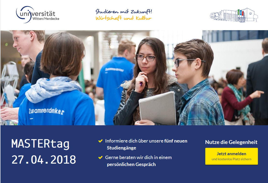 Das übergreifende Ziel aller Studiengänge ist die Bildung und Ausbildung künftiger Führungskräfte und Entscheidungsträger, die kritisch denken, unternehmerisch handeln und auf dem Fundament einer breiten Bildung Verantwortung für sich und die Gesellschaft übernehmen wollen. Vorgestellt werden die neuen Masterprogramme beim Mastertag Kultur und Wirtschaft am 27. April ab 15 Uhr an der Universität. Hier gibt es neben Impulsvortrag und Podiumsdiskussion zu verantwortungsvoller Führung auch Probeseminare und die Möglichkeit mit Studierenden und Dozierenden in Kontakt zu kommen, um alle Fragen zu den neuen Programmen und einem Studium in Witten zu stellen. Anmeldungen unter mastertag.uni-wh.de.