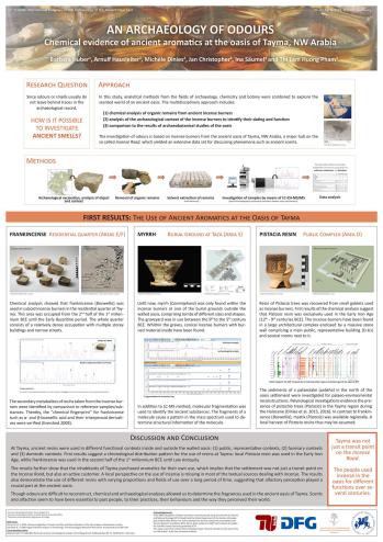 Im Rahmen des DAI-Projekts in der Oase Tayma im Nordwesten Saudi-Arabiens untersuchte ein interdisziplinäres Team rund um Barbara Huber Rückstände von Weihrauch, die aus mehr als 60 Weihrauchbrennern der Oase stammen. Huber und ihren Kolleg*innen aus dem Tayma-Projekt (A. Hausleiter), dem Referat Naturwissenschaften des DAI (M. Dinies) sowie des Instituts für Ökologie der Technischen Universität Berlin (J. Christopher, I. Säumel, Th. L. Huong Pham) gelang im Labor der Nachweis, dass in Tayma unterschiedliche Aromata für die Erzeugung von Wohlgerüchen verwendet wurden. Neben Pistazie konnten sie Weihrauch und Myrrhe nachweisen. Besonders bemerkenswert ist, dass diese Aromata offenbar nach funktionellen Kontexten differenziert verwendet wurden (Tempel, Wohnhäuser, Gräber).