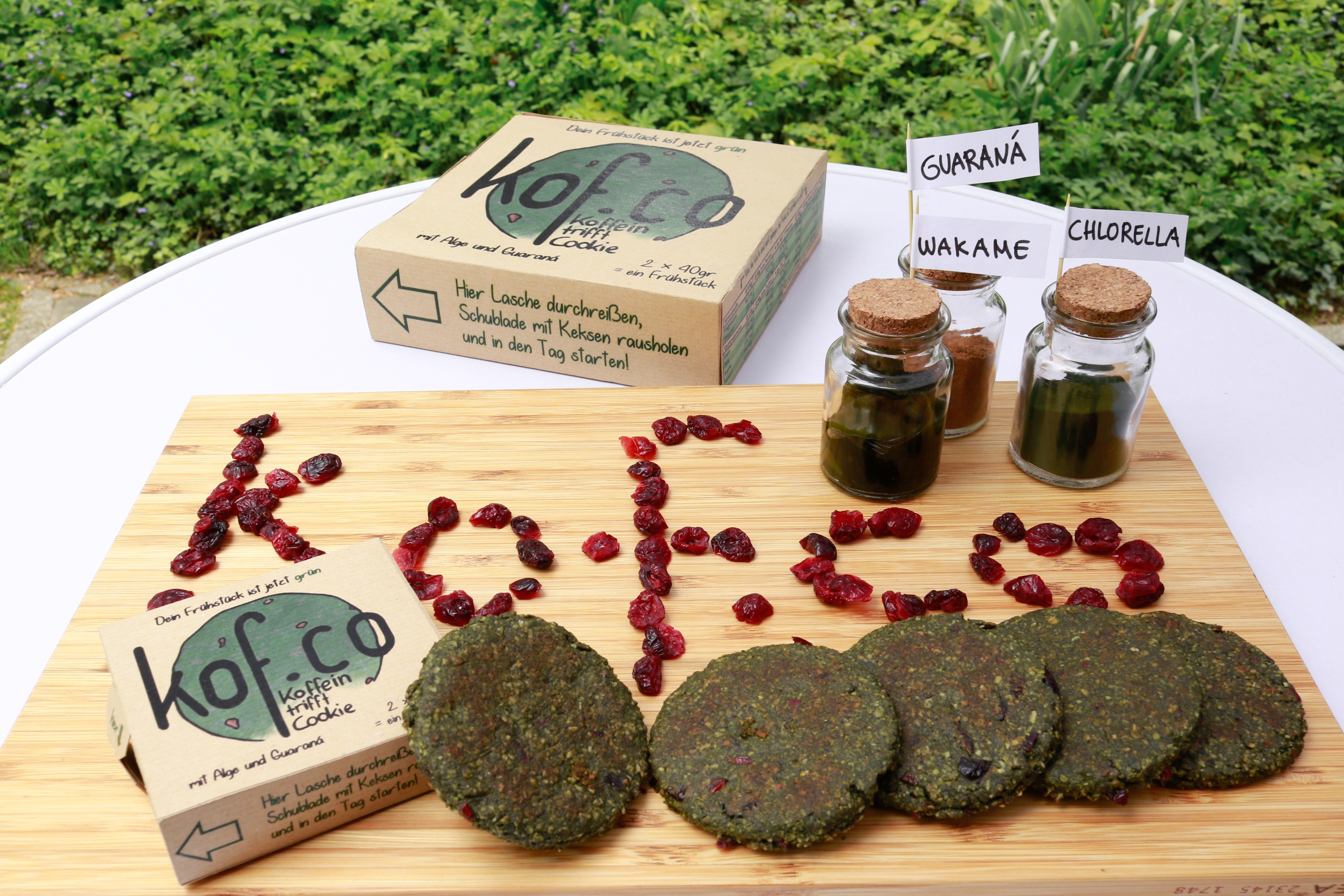 Gemäß des Mottos "Koffein trifft Cookie" bietet "kof.co" dank seines Guaraná-Gehaltes eine aufweckende Alternative zu herkömmlichen Koffeinquellen. Der Einsatz der Süßwasser-Mikroalge Chlorella und der Salzwasser-Makroalge Wakame sorgt nicht nur für die charakteristische Farbe des Frühstückskekses, sondern versorgt den Körper mit essentiellen Vitaminen, Mineralstoffen und Spurenelementen. Durch die praktische, zu 100 % biologisch abbaubare Verpackung ist "kof.co" gut für die Umwelt und ermöglicht ein vollwertiges Frühstück für unterwegs. Bei der Entwicklung und Umsetzung der Idee wurden das fünfköpfige Team unterstützt durch Prof. Dr. Heike P. Karbstein sowie ihre Mitarbeiterinnen Maria Quevedo und Dr. Ulrike S. van der Schaaf.