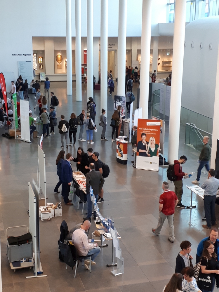 Viel los auf dem Campus Augustusplatz: Bei sonnigem Frühlingswetter nutzten am heutigen Samstag (28. April 2018) knapp 4.000 Besucher die vielfältigen Angebote des Studieninformationstags der Universität Leipzig. Sie informierten sich über die zahlreichen Ausbildungsangebote der Alma mater Lipsiensis. Zum Campus Augustusplatz und in die Einrichtungen in der Innenstadt kamen vor allem studieninteressierte Schüler der 11. und 12. Klassen, aber auch deren Eltern und Großeltern sowie Masterinteressenten, um sich einen Überblick über das Studiengangspektrum und die Modalitäten des Hochschulzugangs zu verschaffen. Insgesamt 75 Veranstaltungen standen auf dem Programm.