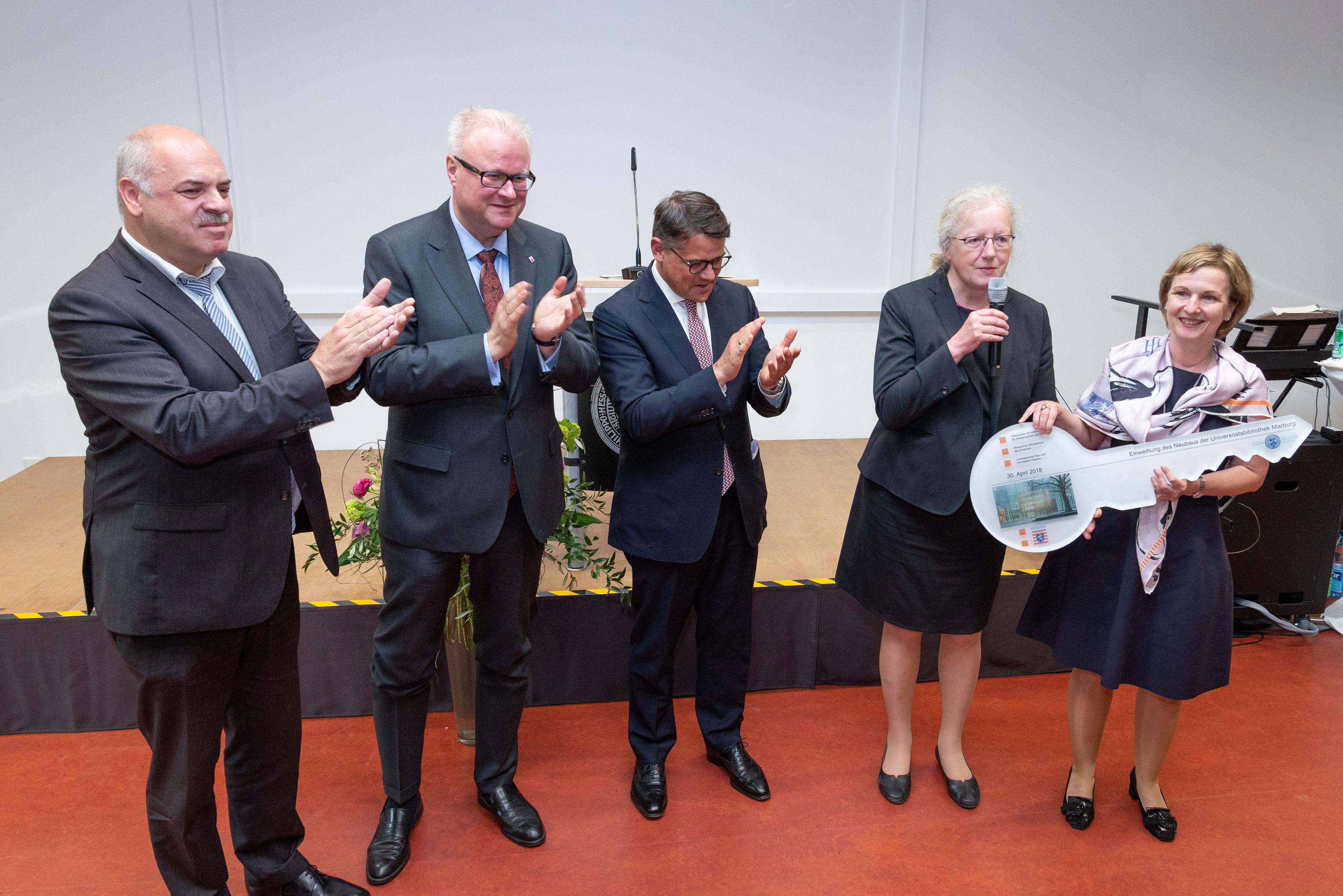 Im Beisein von Wissenschaftsminister Boris Rhein und Finanzminister Dr. Thomas Schäfer wurde am Montag, 30. April 2018, die neue Marburger Universitätsbibliothek (UB) nach rund vierjähriger Bauzeit offiziell eröffnet.