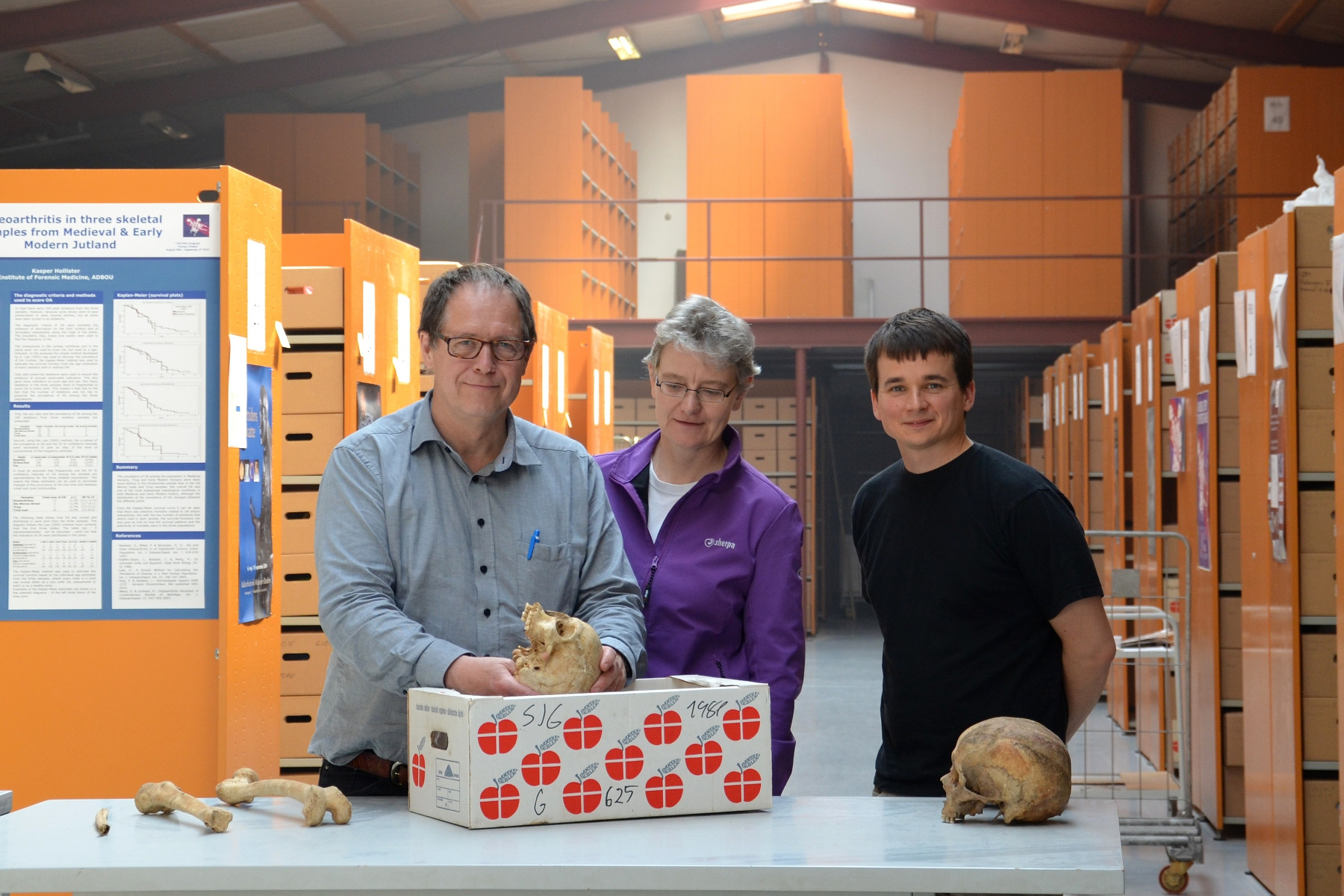 Caption: Jesper Boldsen from the University of Southern Denmark (left) explains the bone changes of a woman who contracted leprosy to Almut Nebel and Ben Krause-Kyora from Kiel University.