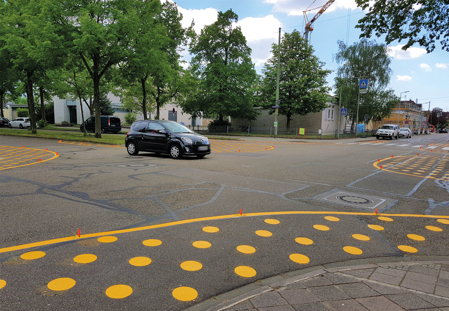 Gelbe Punkte auf der Straße in Knielingen – was steckt dahinter? Forschungsprojekt der Hochschule Karlsruhe führt zu experimenteller Umgestaltung der Straßensituation zur Verbesserung des Fußgängerverkehrs