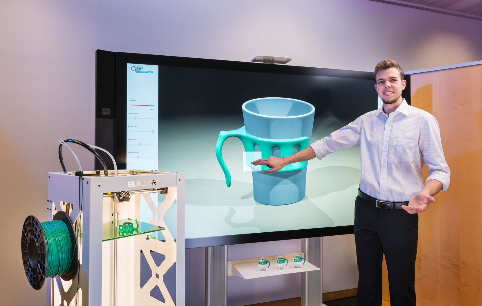 Auf dem Ausstellungsschiff erhalten Besucher die Möglichkeit, am Monitor Halterungen für ein Espressoglas individuell in einem 3D Modell zu gestalten. Das System prüft, ob die Halterung das volle Espressoglas halten würde und schlägt gegebenenfalls leichte Veränderungen vor. Nach bestandener Machbarkeitsprüfung kann man die Produktion starten.