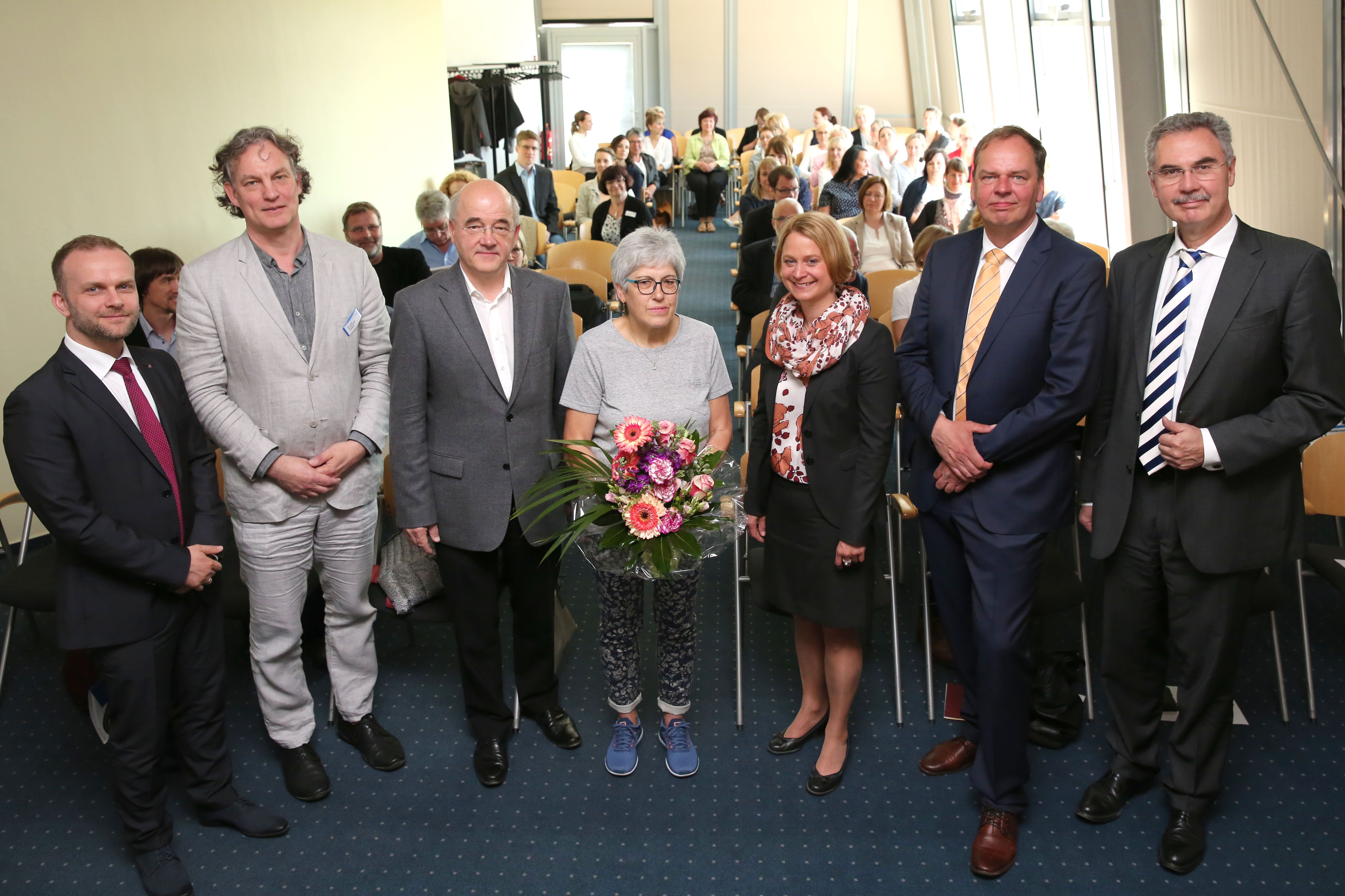 Wissenschaftsministerin Birgit Hesse (re.) bedankte sich heute bei der Neubrandenburgerin Christina Ludwinski, die als 20.000. Probandin an der Gesundheitsstudie NAKO teilnahm - hier mit (v.li.) dem Neubrandenburger Oberbürgermeister Silvio Witt, dem Ärztlichen Direktor des Dietrich-Bonhoeffer-Klinikums Neubrandenburg, Dr. Rainer Kirchhefer, NAKO-Vorstand Prof. Klaus Berger, 20.000. Teilnehmerin Christina Ludwinski sowie Wissenschaftsministerin Birgit Hesse, Prof. Henry Völzke und Prof. Markus Lerch (beide Unimedizin).
