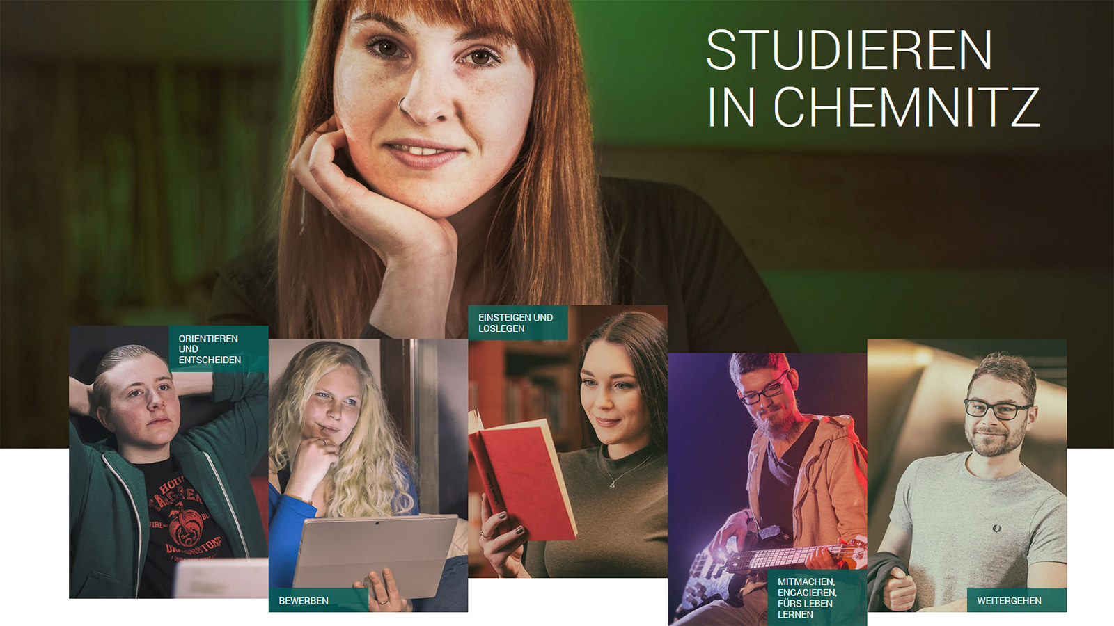 Jede dieser fünf Rubriken wird von Studierenden der TU Chemnitz eingeführt. Zudem ist Susanne Martin das „zentrale“ Gesicht von „Studieren in Chemnitz“. Die Studentin der Europa-Studien mit ihren markanten roten Haaren freut sich, künftigen Studierenden den Weg nach Chemnitz weisen zu können: „Ich hätte mir zu Beginn meines Studiums auch so eine Möglichkeit gewünscht und finde das Design der neuen Landingpage wirklich schick und den Aufbau der Website logisch strukturiert. Besonders gefällt mir, dass auch das Leben in Chemnitz, die vielen kulturellen Möglichkeiten in der Stadt und die Zeit nach dem Studium eine Rolle spielen“, sagt die Studentin.