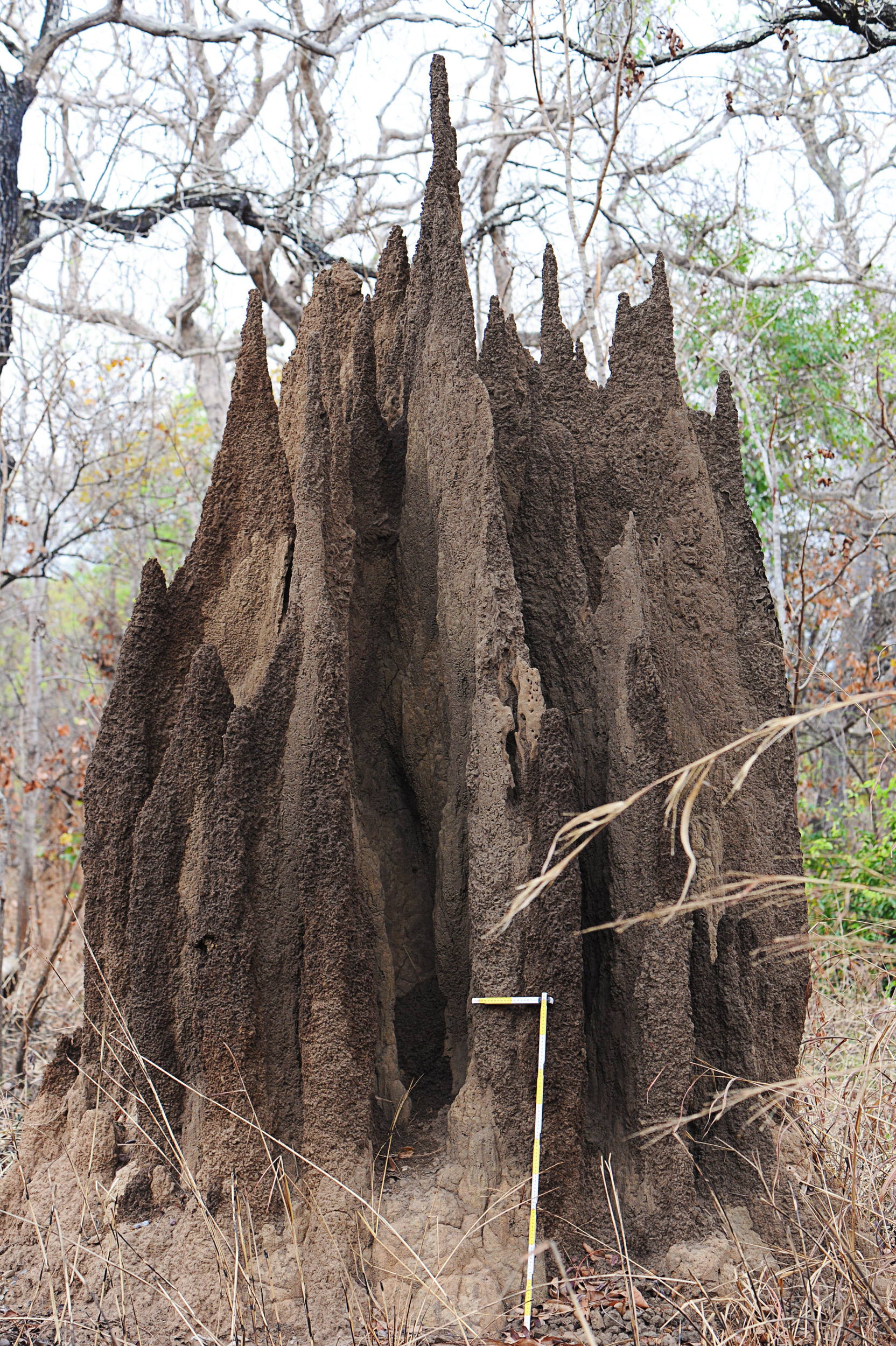 Korb has studied Macrotermes bellicosus since her doctoral thesis. This termite species lives in the savanna of western Africa and builds meters-high mounds. They have an organized society with division of labor, something that led to the concept of the superorganism [del: becoming established in research]: a queen and a king are responsible for reproduction, soldiers defend the colony, workers build the mound and gather grass and leaves, which are used to feed a fungus that they cultivate in specially developed “gardens”, where it decomposes complex plant compounds and thus concentrates nitrogen. This in turn is an important nutrient for the termites, and it limits the growth of the colony if insufficient quantities are available. The extreme sensitivity of the fungus means that the temperature in the interior of the mound must always be around 30 degrees Celsius.