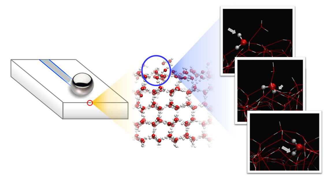Um den Ursprung dieser temperaturabhängigen Gleitfähigkeit zu untersuchen, führten die Forscher spektroskopische Messungen des Zustands von Wassermolekülen an der Oberfläche durch und verglichen diese mit theoretischen Berechnungen (Moleküldynamik-Simulationen). Diese Kombination von Experiment und Theorie zeigt, dass zwei Arten von Wassermolekülen an der Eisoberfläche existieren: Wassermoleküle, die an das darunter liegende Eis gebunden sind (gebunden durch drei Wasserstoffbrückenbindungen) und mobile Wassermoleküle, die nur durch zwei Wasserstoffbrückenbindungen angebunden sind. Diese mobilen Wassermoleküle rollen wie kleine Kugeln über die Eisoberfläche. Hierbei werden sie von thermischen Schwingungen angetrieben.