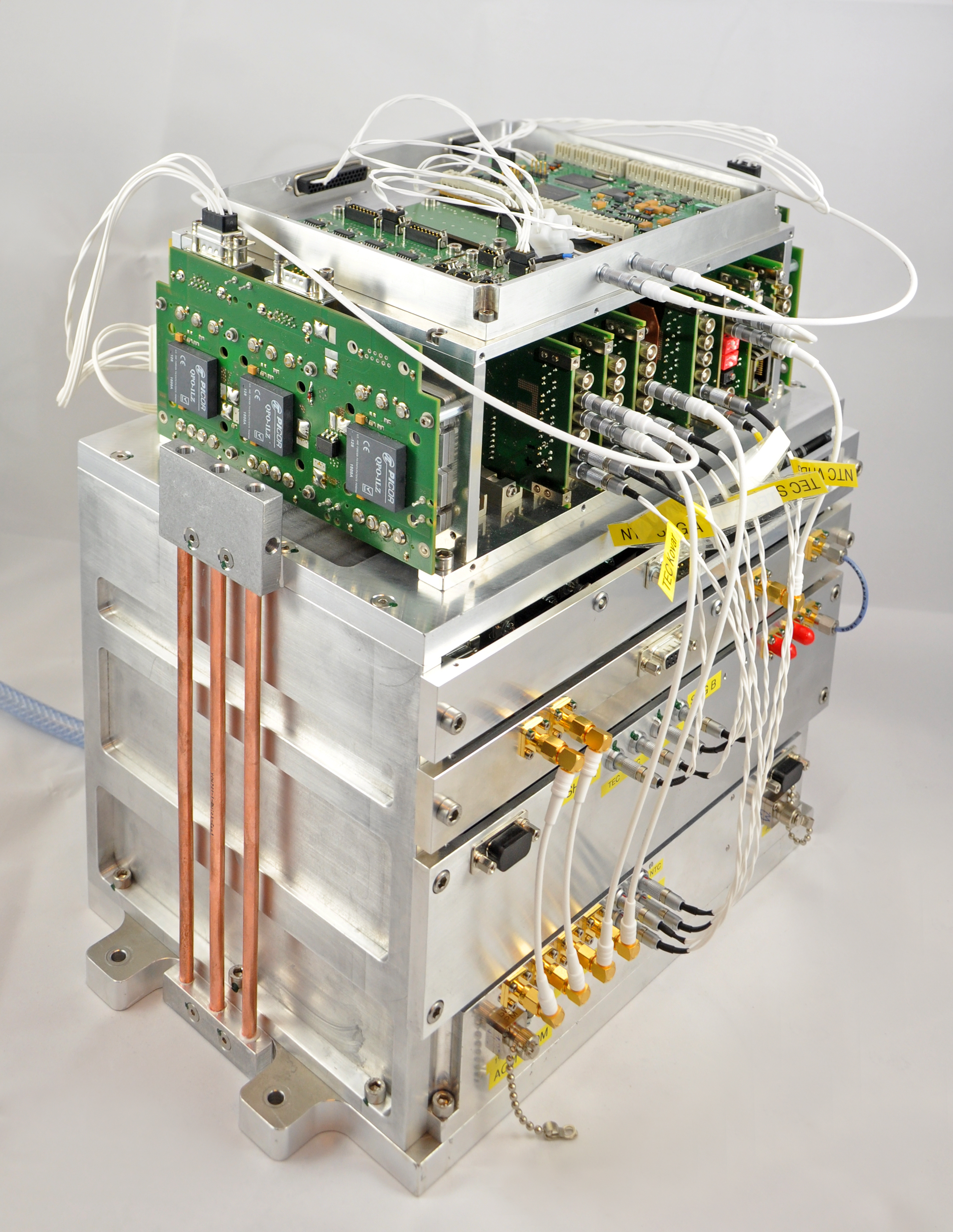 Herzstück des Systems ist ein mikrointegrierter ECDL-MOPA mit einem ECDL als Lokaloszillator (Master Oscillator, MO) und einem Rippenwellenleiter-Halbleiterverstärker als Leistungsverstärker (Power Amplifier, PA), der am FBH entwickelt und realisiert wurde. Das 1064 nm Lasermodul ist in einem 125 x 75 x 22,5 mm³ kleinen Gehäuse vollständig verkapselt und liefert eine optische Leistung von 570 mW innerhalb der Linienbreite des freilaufenden Lasers von 26 kHz (FWHM, 1 ms Messzeit). Durch eine polarisationserhaltende, optische Single-Mode-Faser wird das Laserlicht zunächst in zwei Pfade aufgeteilt, moduliert, frequenzverdoppelt und für die Doppler-freie Sättigungsspektroskopie aufbereitet. Die vom Deutschen Zentrum für Luft- und Raumfahrt (DLR) geförderte Technologieentwicklung in JOKARUS baut auf den früheren Missionen FOKUS, FOKUS reflight, KALEXUS und MAIUS auf.