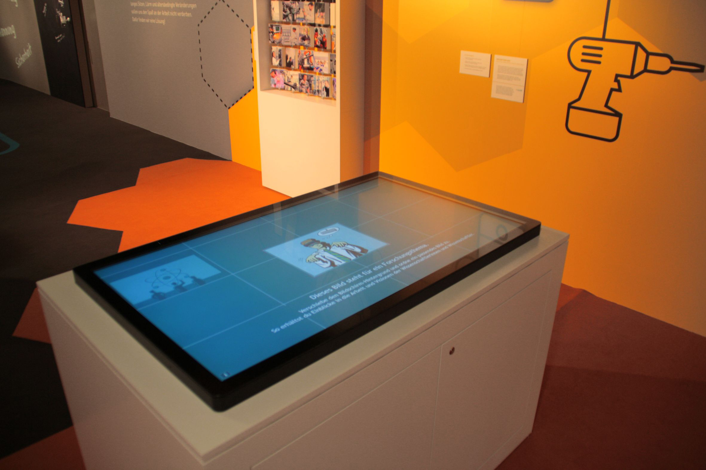 Der Touch-Tisch mit dem Titel „Bilder einer digital-realen Arbeitswelt“ wurde im Rahmen des Transregionalen Sonderforschungsprojekts SFB-TRR 161 (Quantifizierbarkeit im Visual Computing) entwickelt. Visual Computing steht für die computergenerierte Erzeugung interaktiver Bilder aus großen Datenmengen sowie für die Echtzeitgewinnung von Informationen aus Video- oder Fotoaufnahmen, um daraus neue Anwendungen zu erschießen. Das Exponat zeigt interaktiv und spielerisch die aktuelle Grundlagenforschung rund um mögliche Arbeitswerkzeuge der Zukunft wie Virtual- und Mixed-Reality-Brillen oder Großprojektionsdisplays, wie sie an den Universitäten Stuttgart und Konstanz erforscht werden.