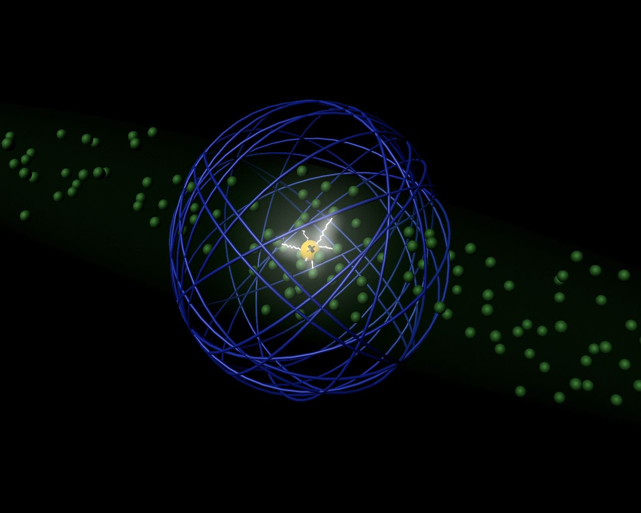In dem Experiment regten die Forscherinnen und Forscher ein Elektron eines einzelnen Atoms in einem Bose-Einstein-Kondensat mit Laserstrahlen in einen riesigen sogenannten Rydberg-Orbit an. Dadurch hält sich das angeregte Elektron bis zu 3.7µm vom Kern entfernt auf, fünfzehntausend Mal weiter als im Grundzustand. Das Quantengas wurde in einer winzig kleinen optischen Dipolfalle gehalten. Die Wolke aus vielen Tausend Atomen war damit um den Faktor drei kleiner als der Elektronenorbit.
