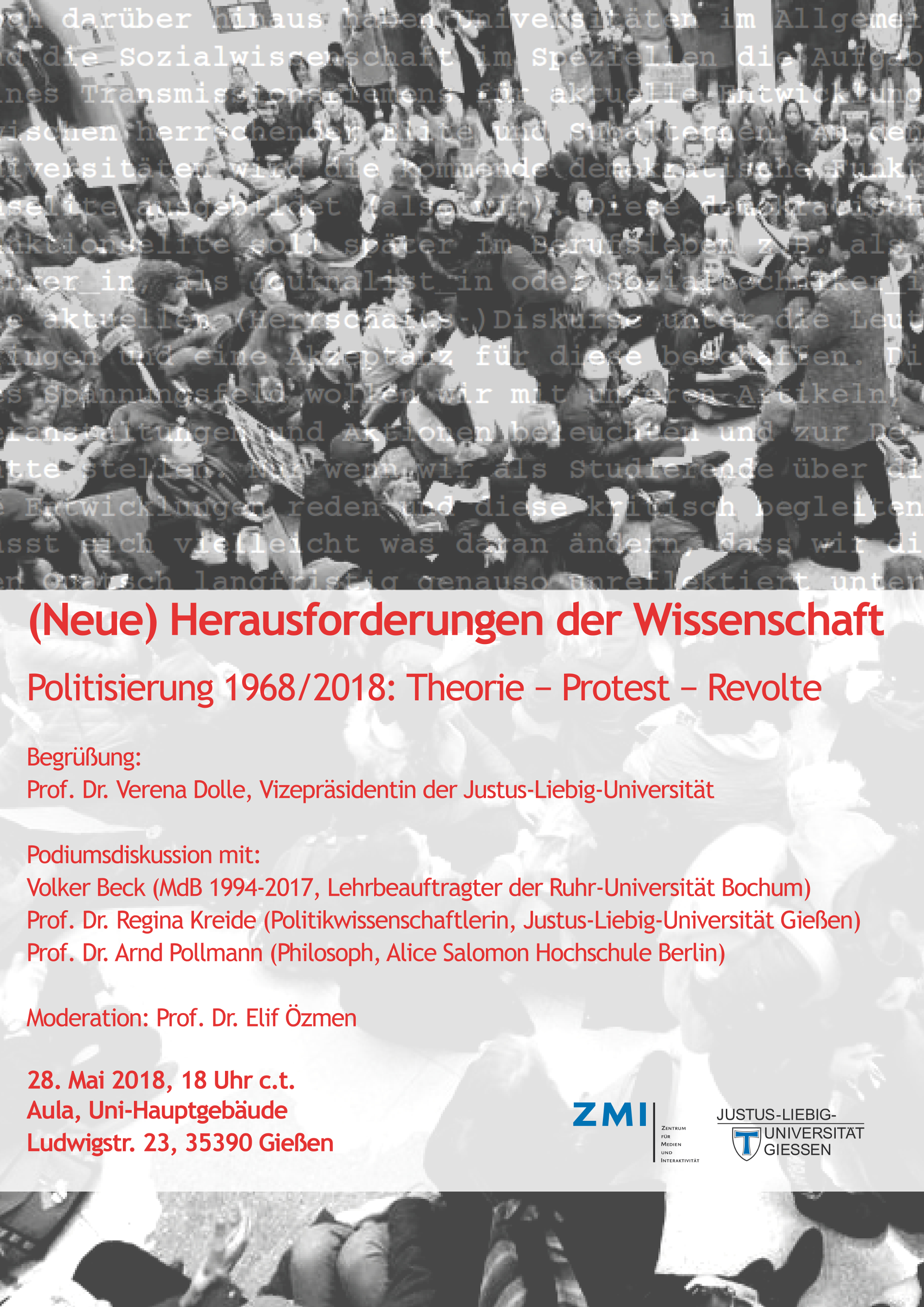 am 28. Mai 2018 (Beginn: 18.00 Uhr) zum Thema „Politisierung 1968/2018: Theorie – Protest – Revolte“.