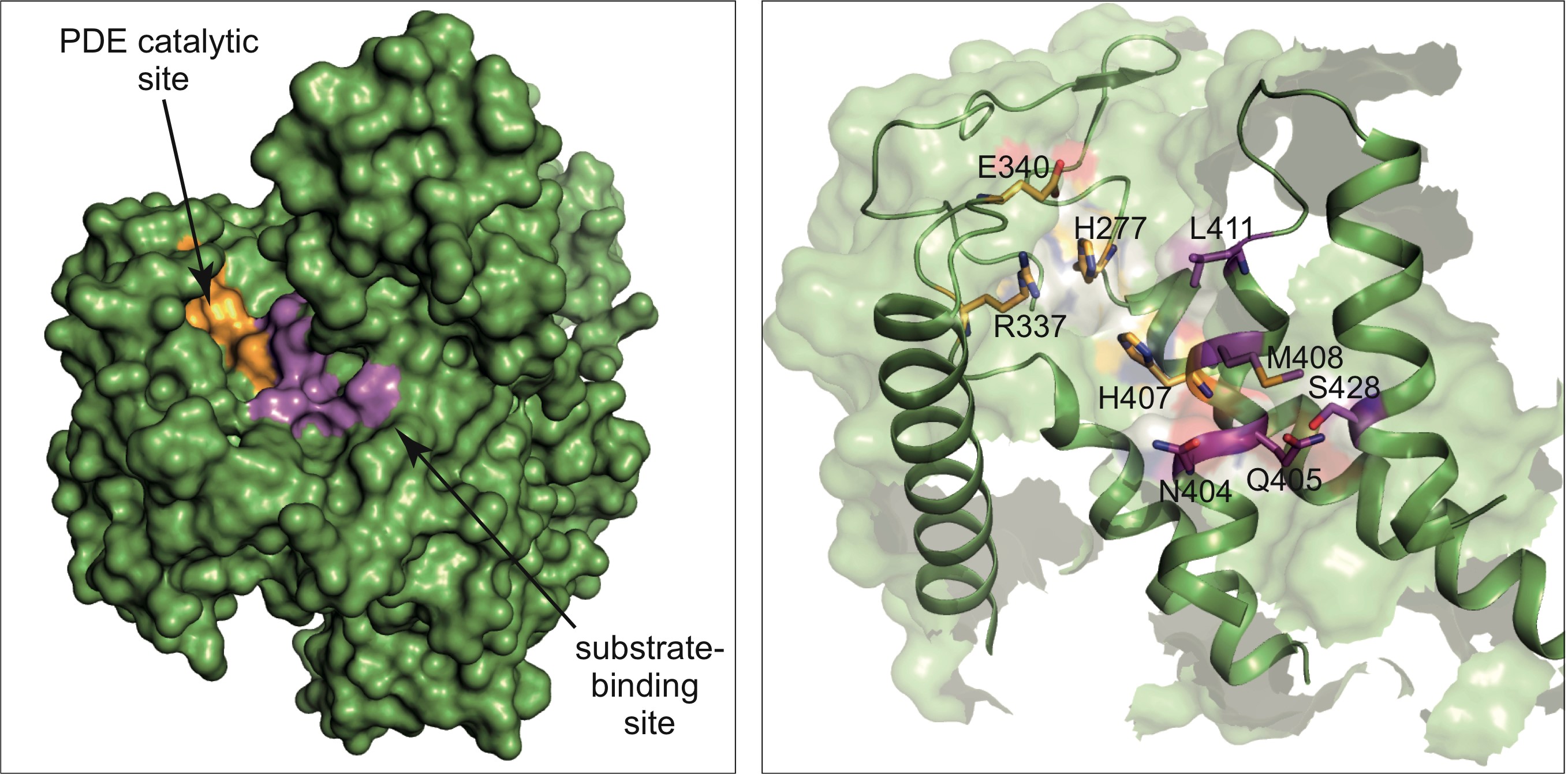 Caption: A detailed view of the 3D structure of the enzymatic active part of SdeA toxin (green). On the left, the essential catalytic surface is depicted in orange and the area for binding target proteins in purple. On the right, the amino acid residues involved in the reaction are highlighted. The detailed molecular picture now enables the design of suitable inhibitors. Source: Nature/Kalayil et al, Mai 2018
