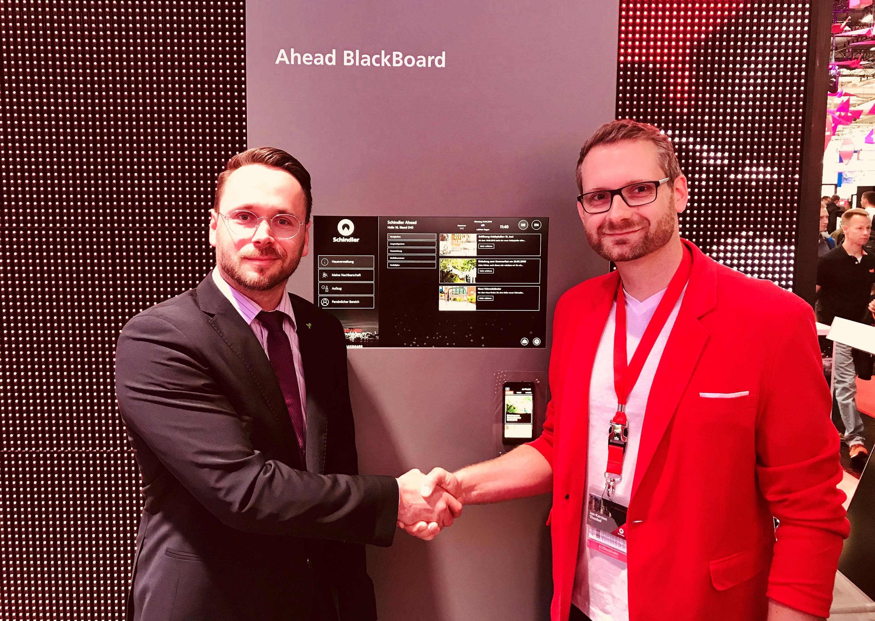(Wismar/Berlin/Hannover) Nachdem sich die beiden Innovationsträger Jan-Karsten Thoebel von der Schindler Deutschland AG & Co KG und Prof. Dr.-Ing. Matthias Wißotzki von der Hochschule Wismar bereits im letzten Jahr mit mehr Interaktion und Kommunikation vor Aufzügen befasst haben, stand in diesem Jahr ein Projekt im Bereich der digitalen Wohnungswirtschaft im Vordergrund. In diesem Zusammenhang arbeiteten sie an der Umsetzung des „Ahead Blackboard“, einer digitalen Version des analogen schwarzen Bretts, welches häufig in den Eingangsbereichen von Wohngebäuden zu finden ist, und präsentierten es auf der weltgrößten Industriemesse in Hannover.