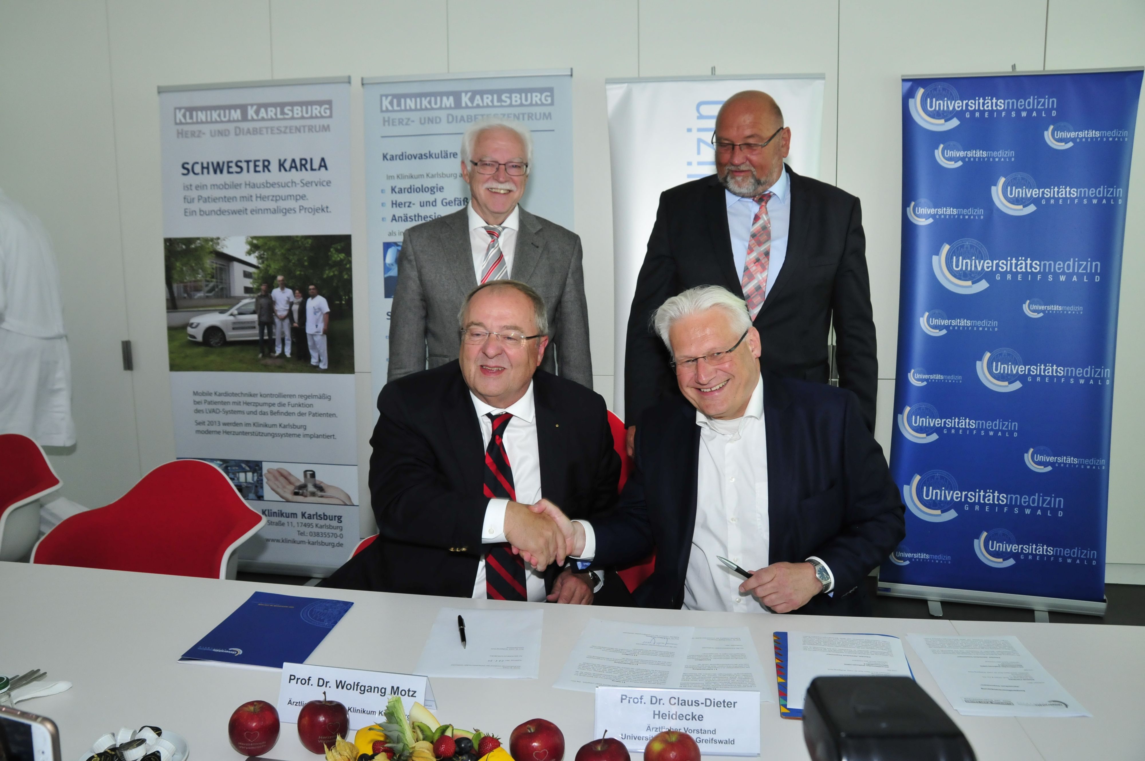 „Mit diesem Schritt werden neue Maßstäbe in der Kooperation von Häusern der Spitzenmedizin in Mecklenburg-Vorpommern gesetzt“, betonten der Ärztliche Vorstand der Unimedizin Greifswald, Prof. Dr. Claus-Dieter Heidecke und der Ärztliche Direktor des Klinikums Karlsburg, Prof. Dr. Wolfgang Motz.„Mit der Vereinbarung gehen die Kooperationspartner neue Wege. Die Versorgung von Patienten mit Herzerkrankungen wird deutlich verbessert. Gerade für ein Flächenland ist die intensive Zusammenarbeit von großem Nutzen. Davon profitieren die Ärzte durch einen engen fachlichen und praktischen Austausch. Patienten werden noch optimaler versorgt. Besonders wichtig ist der enge Schulterschluss mit den Krankenhäusern der Region sowie den niedergelassen Haus- und Fachärzten. So wird die Versorgung des ländlichen Raumes mit ärztlichen Leistungen in Mecklenburg-Vorpommern zukunftssicher aufgestellt“, sagte Gesundheitsminister Harry Glawe.