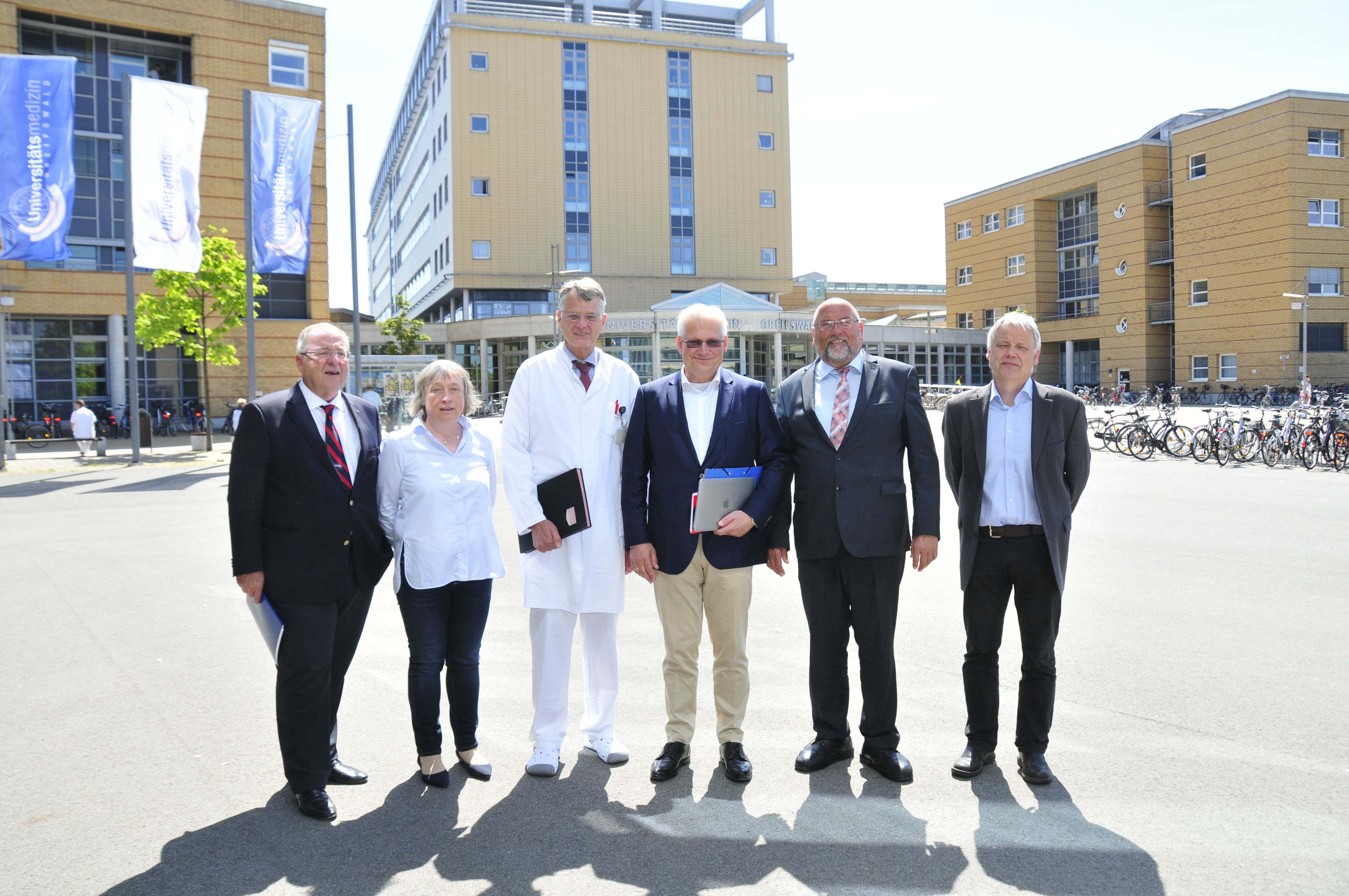 Wollen die Versorgung von Patienten mit Herzerkrankungen in Vorpommern weiter verbessern: der Ärztliche Direktor des Klinikums Karlsburg, Prof. Wolfgang Motz (v. li.), Oberärztin Dr. Sybille Scheler vom Klinikum Karlsburg, der Direktor der Zentrums für Innere Medizin B an der UMG, Prof. Stephan Felix, der Ärztliche Vorstand der Unimedizin Greifswald, Prof. Claus-Dieter Heidecke sowie Gesundheitsminister Harry Glawe und der Direktor der Klinik für Herz-, Thorax- und Gefäßchirurgie des Klinikums Karlsburg, Prof. Hans-Georg Wollert.