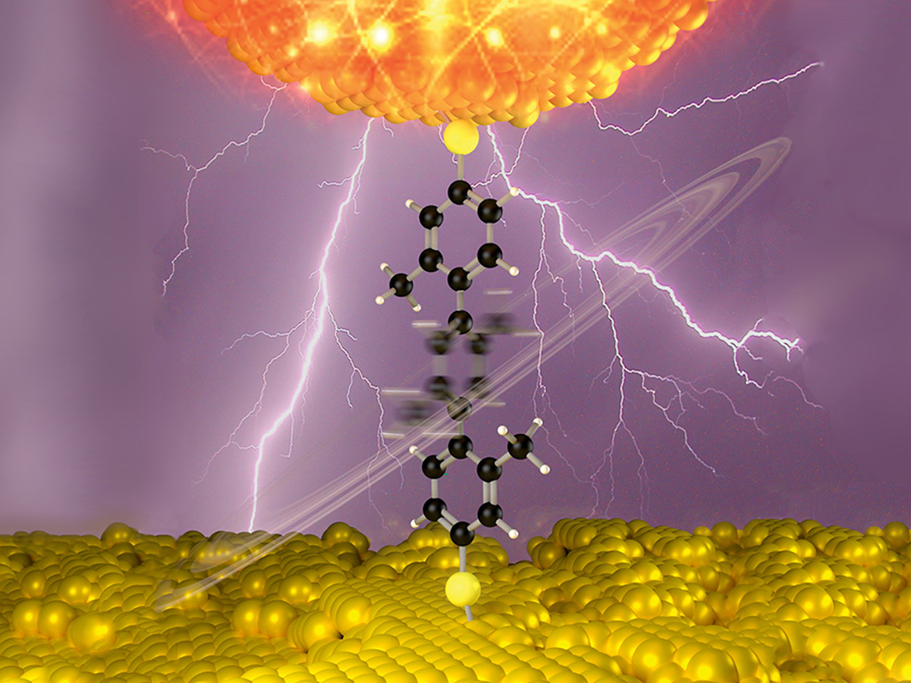 The researchers used molecules synthesized by a team based in Basel and Karlsruhe. The molecules change their structure in a specific way when they get charged. They are arranged on a metal surface and contacted using the corner of a glass fragment with a very thin metal coating as a tip.